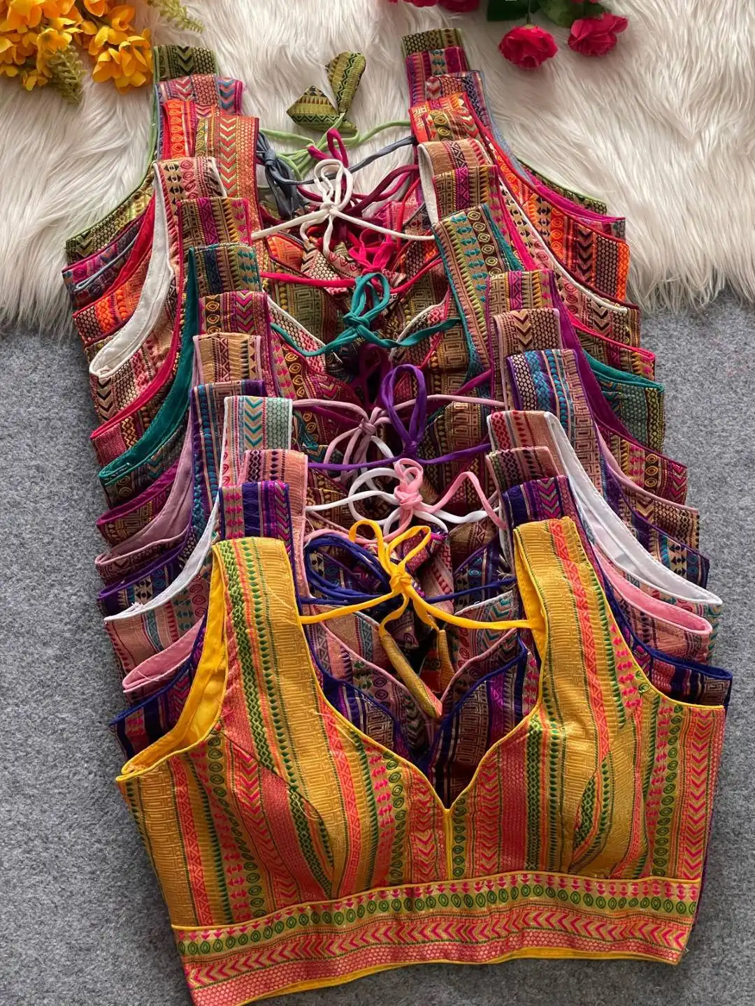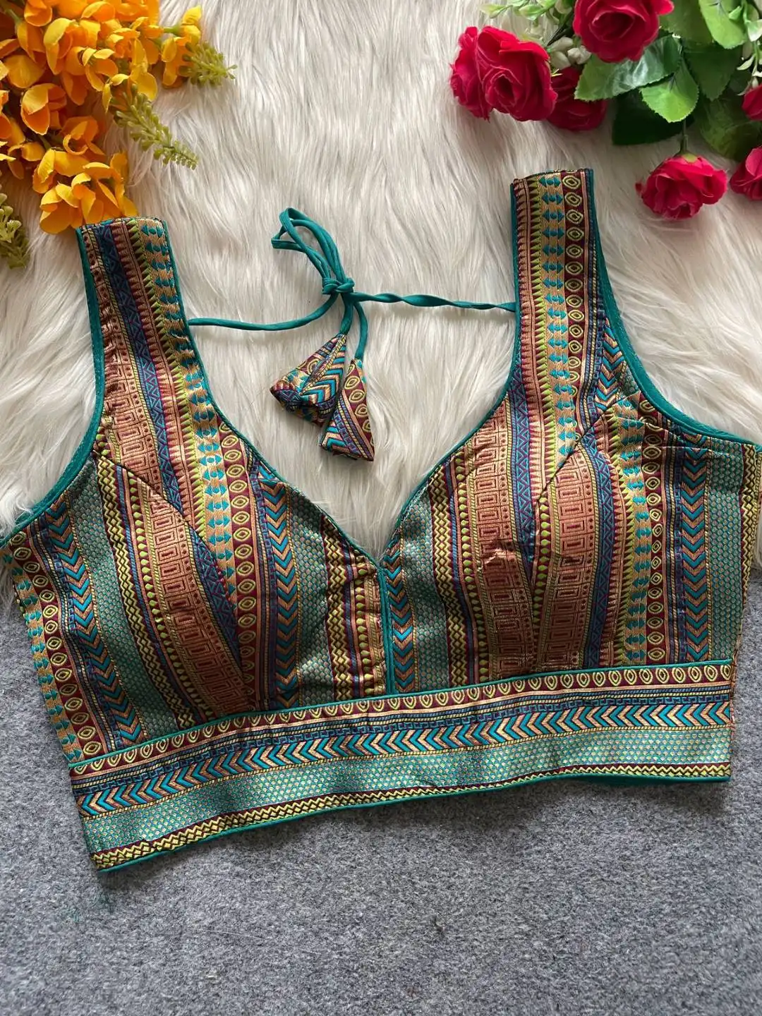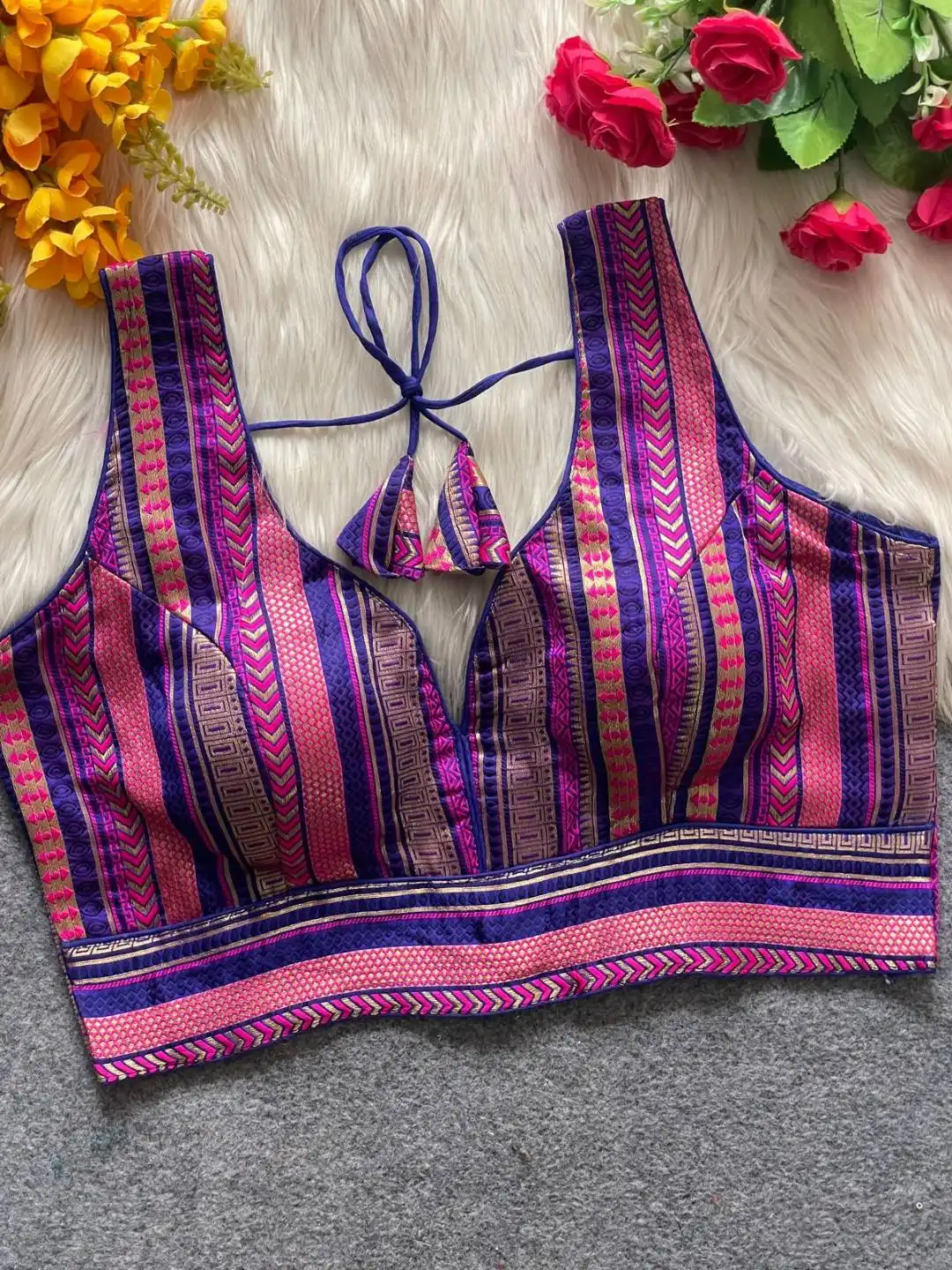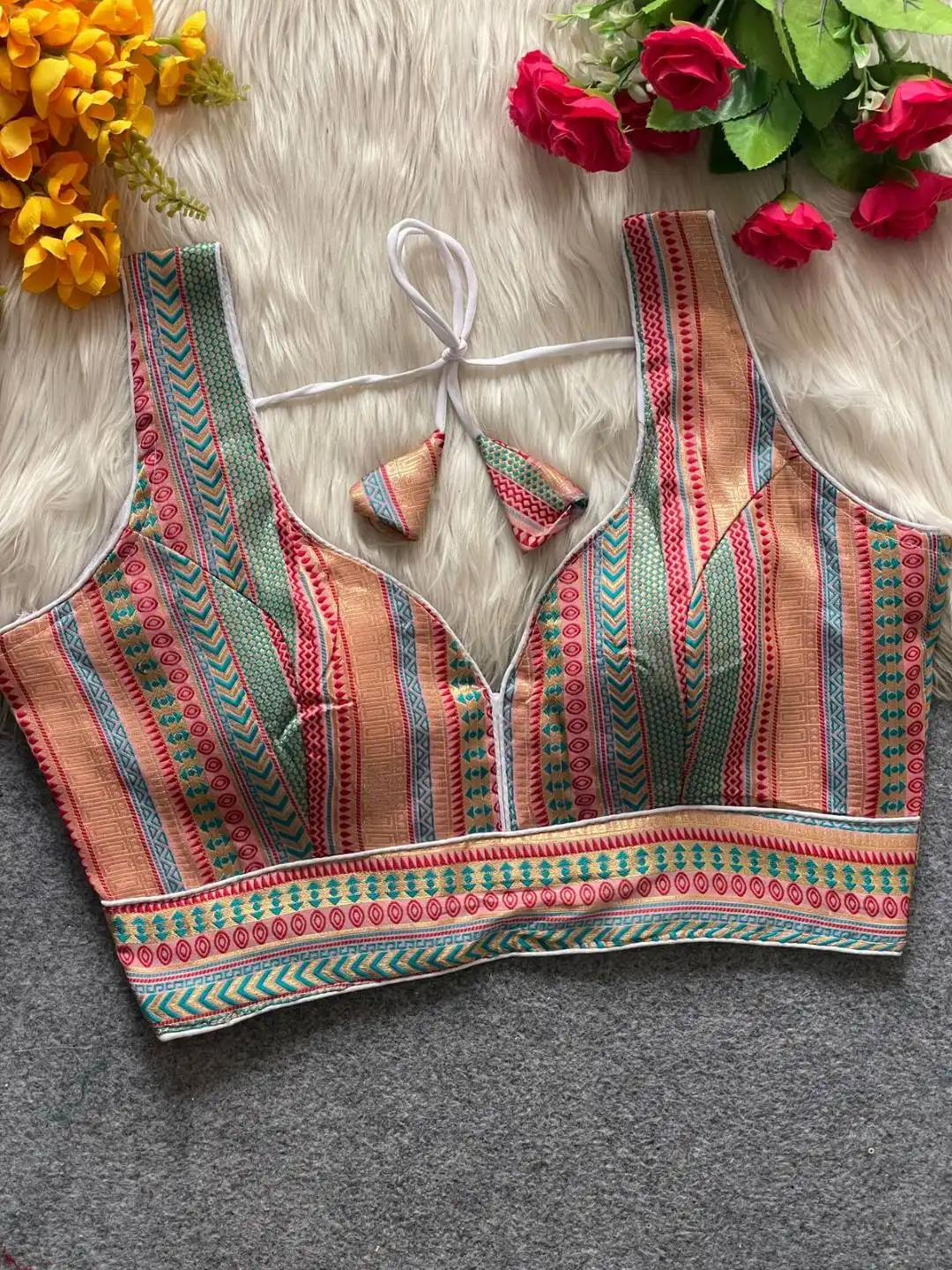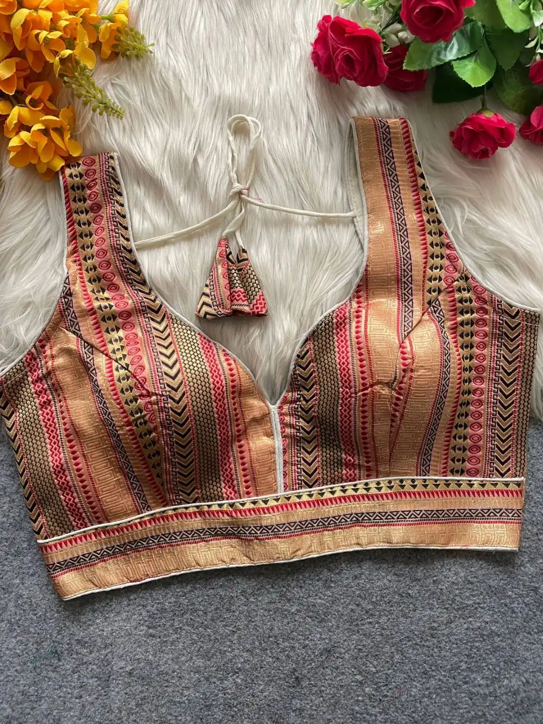 | Blouse: | Heavy Jecquard | SLEEVES:- 10” Sleeves In Side Attached | DESGINE:- Beautiful Blouse Partywear desgine Heavy Stitching Heavy Padded With Beautiful Latkans Back open Style |