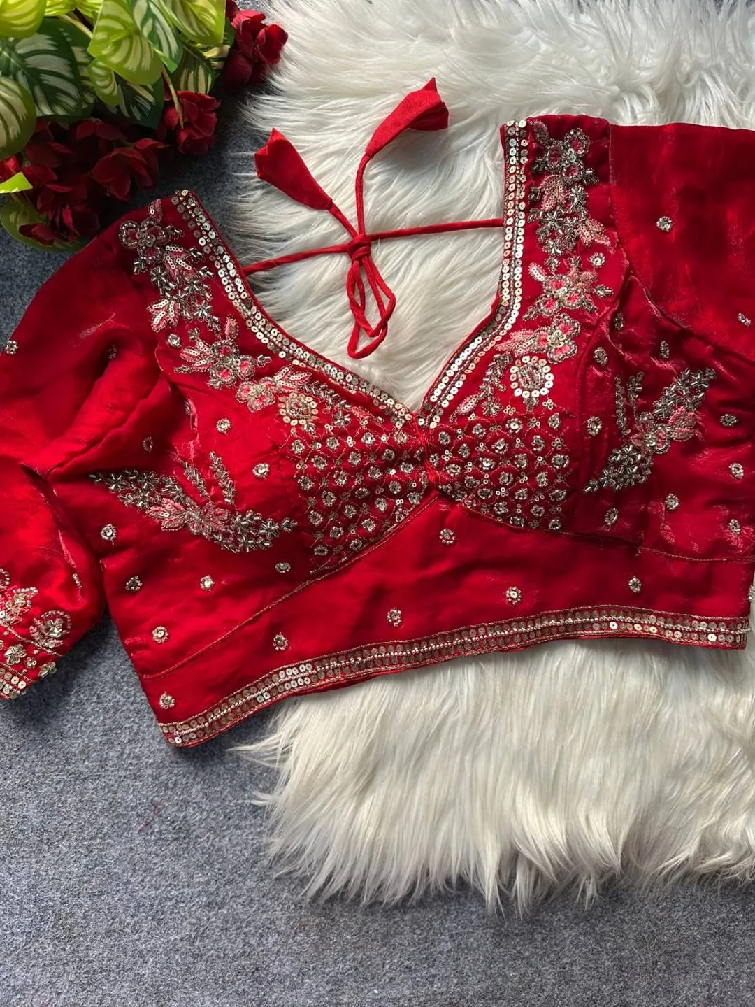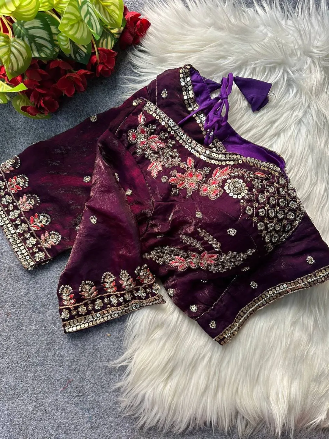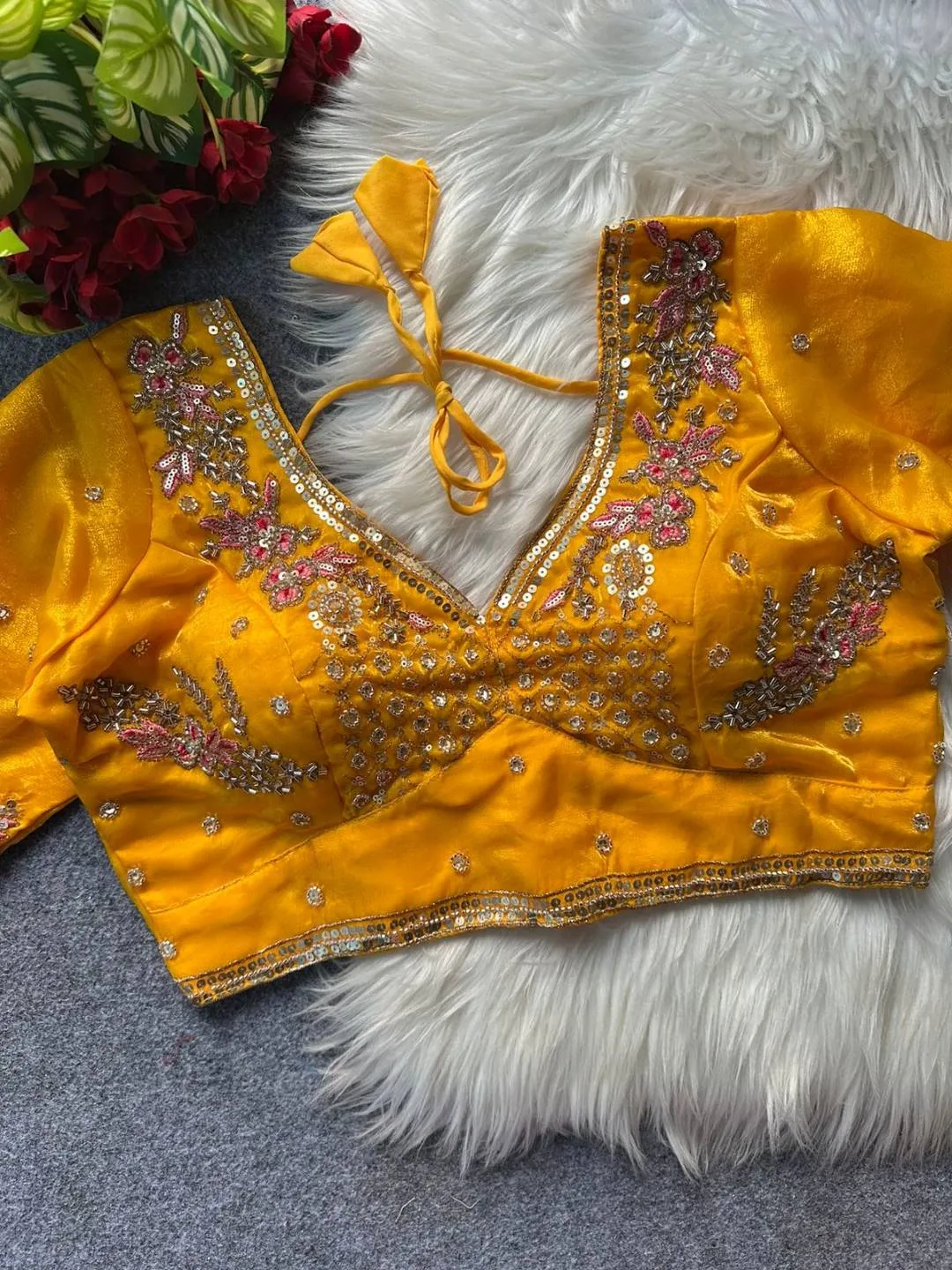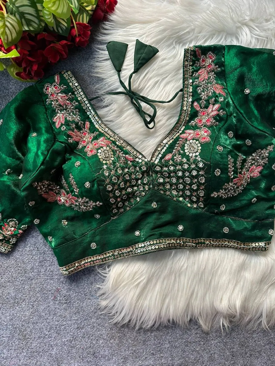 | Blouse | Heavy Pure Fendi Silk, SLEEVES- 12 in Long, DESGINE- Heavy Stitching Heavy Padded Handmade Hooks With Beautiful Latkans BACK open Style, SIZE- 38” Ready Alter Upto 40 Inch. |