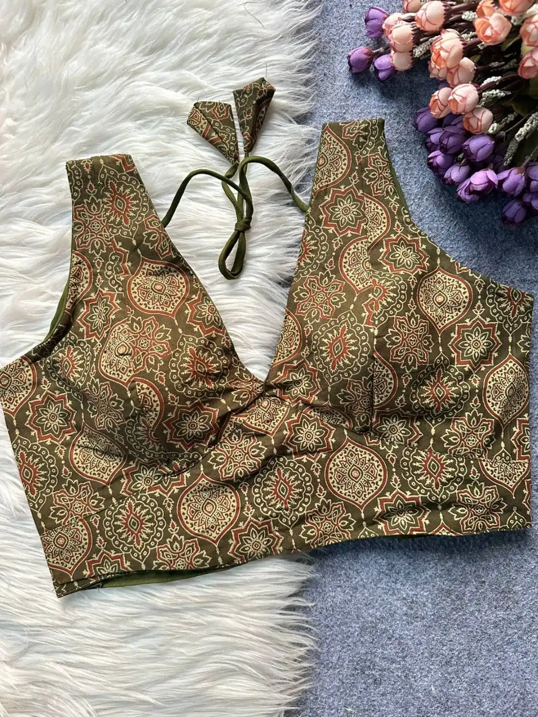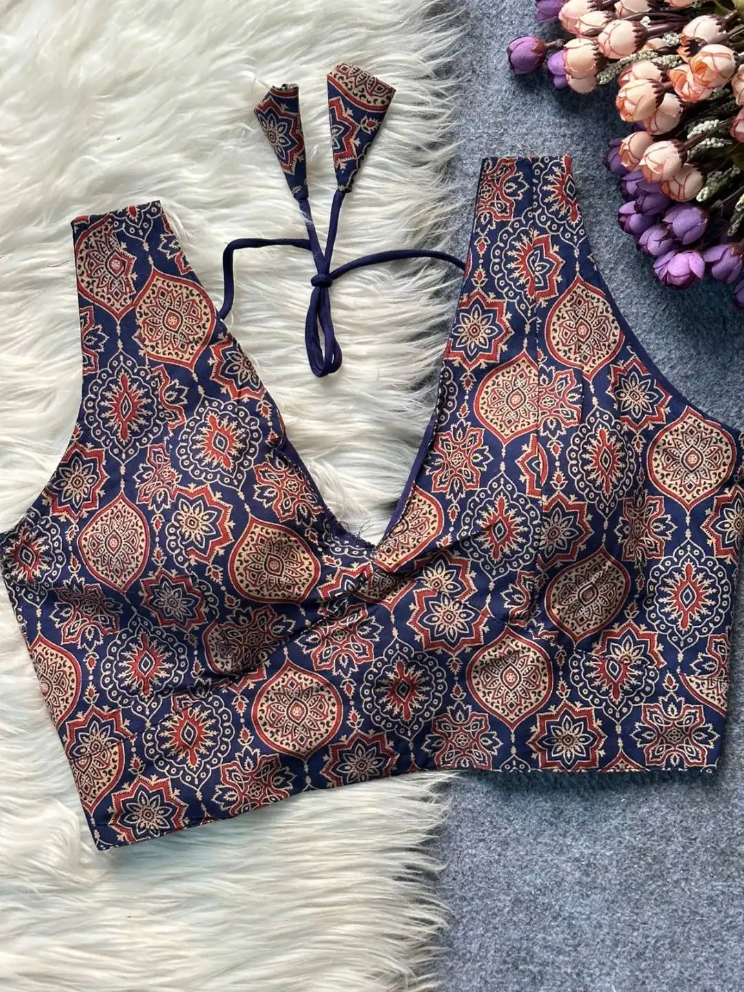 | Blouse: | Ajrakh Cotton Galaxy | Pattern :- V Neck Sabyasachi | Height :- 15 | Open :- Back Hook | Sleeve :- 10 inch Elbow | Pad :- Yes | Lining :- Double Cotton Astar |