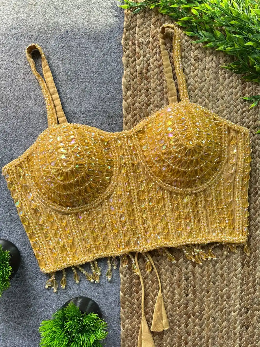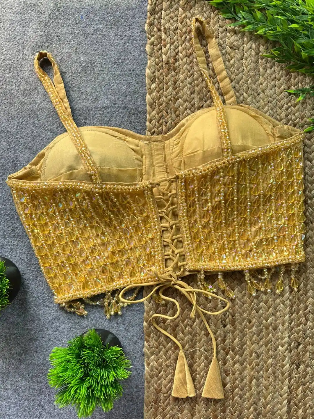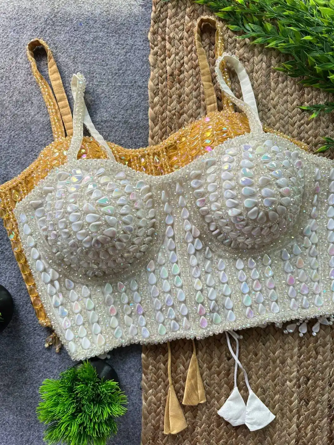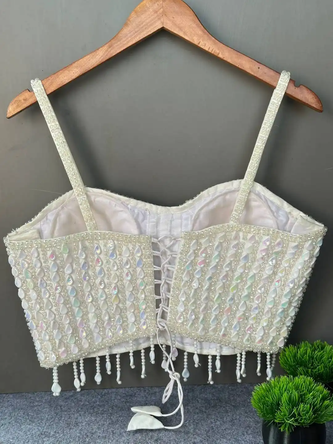 | Blouse: | Fancy Pearl Moti Handcrafted | Sleeves:- SleeveLess | Desgine:- Heavy Stitching Heavy Pearl Blouse Padded With Beautiful Work BACK open Style |