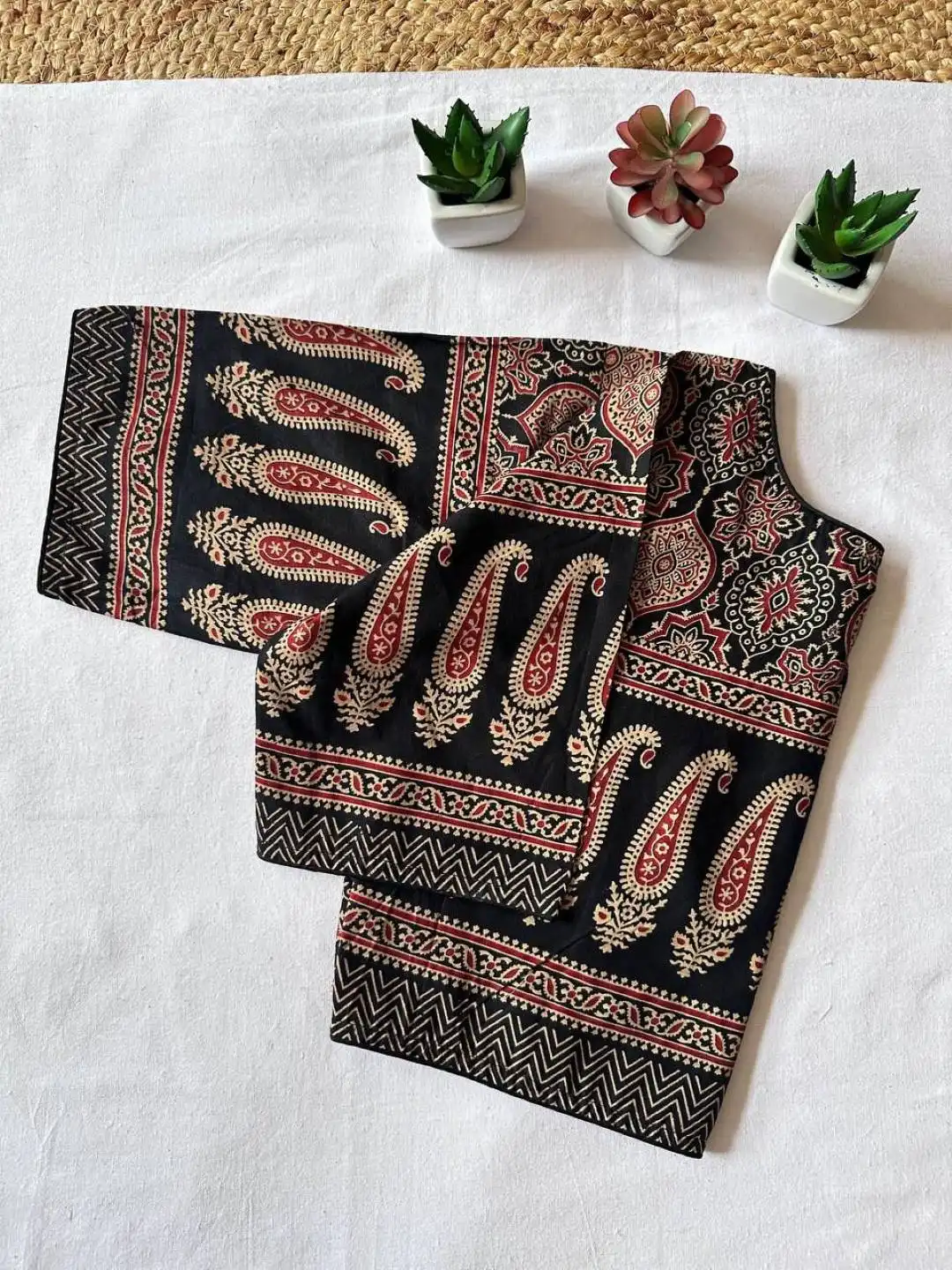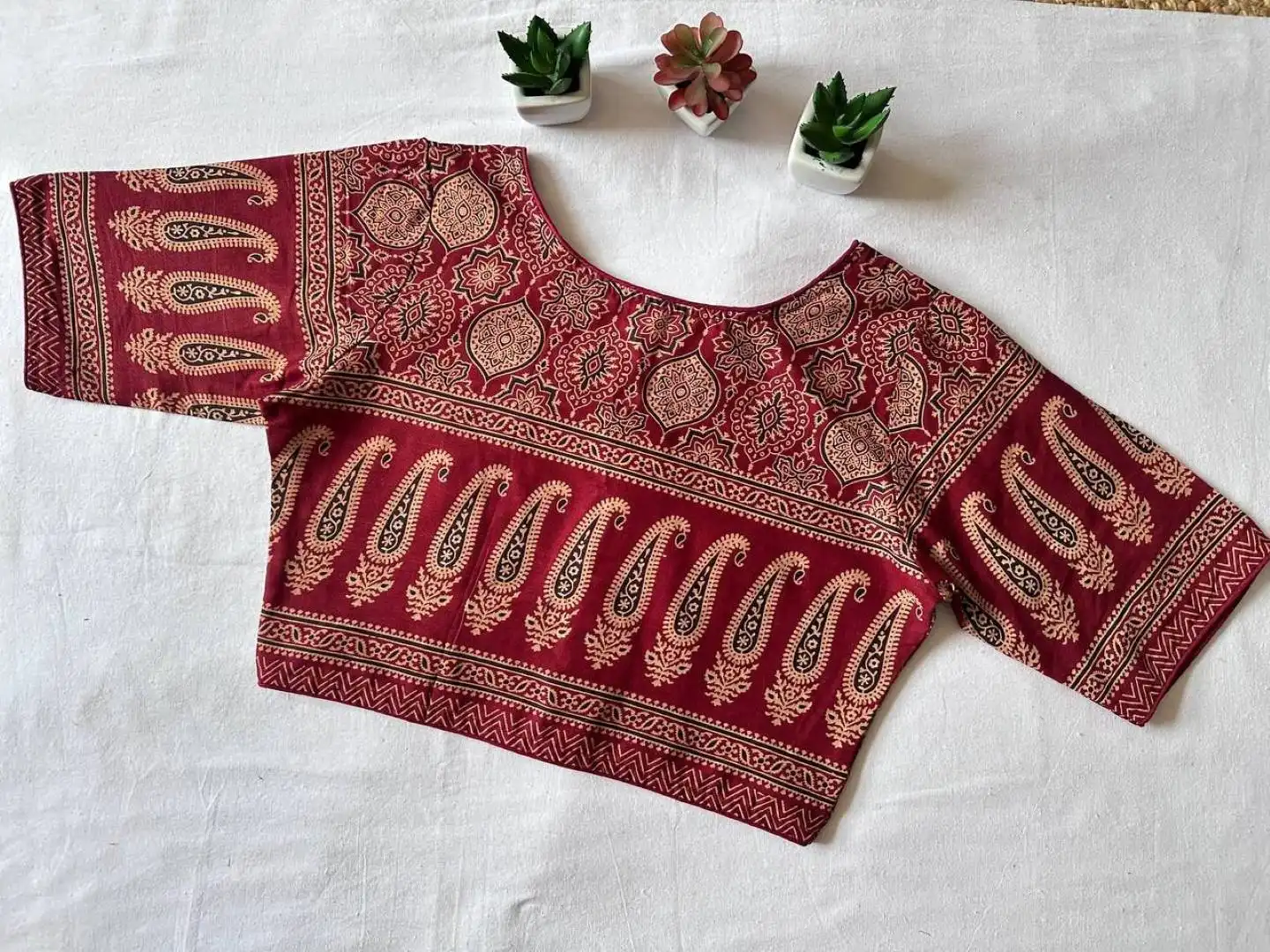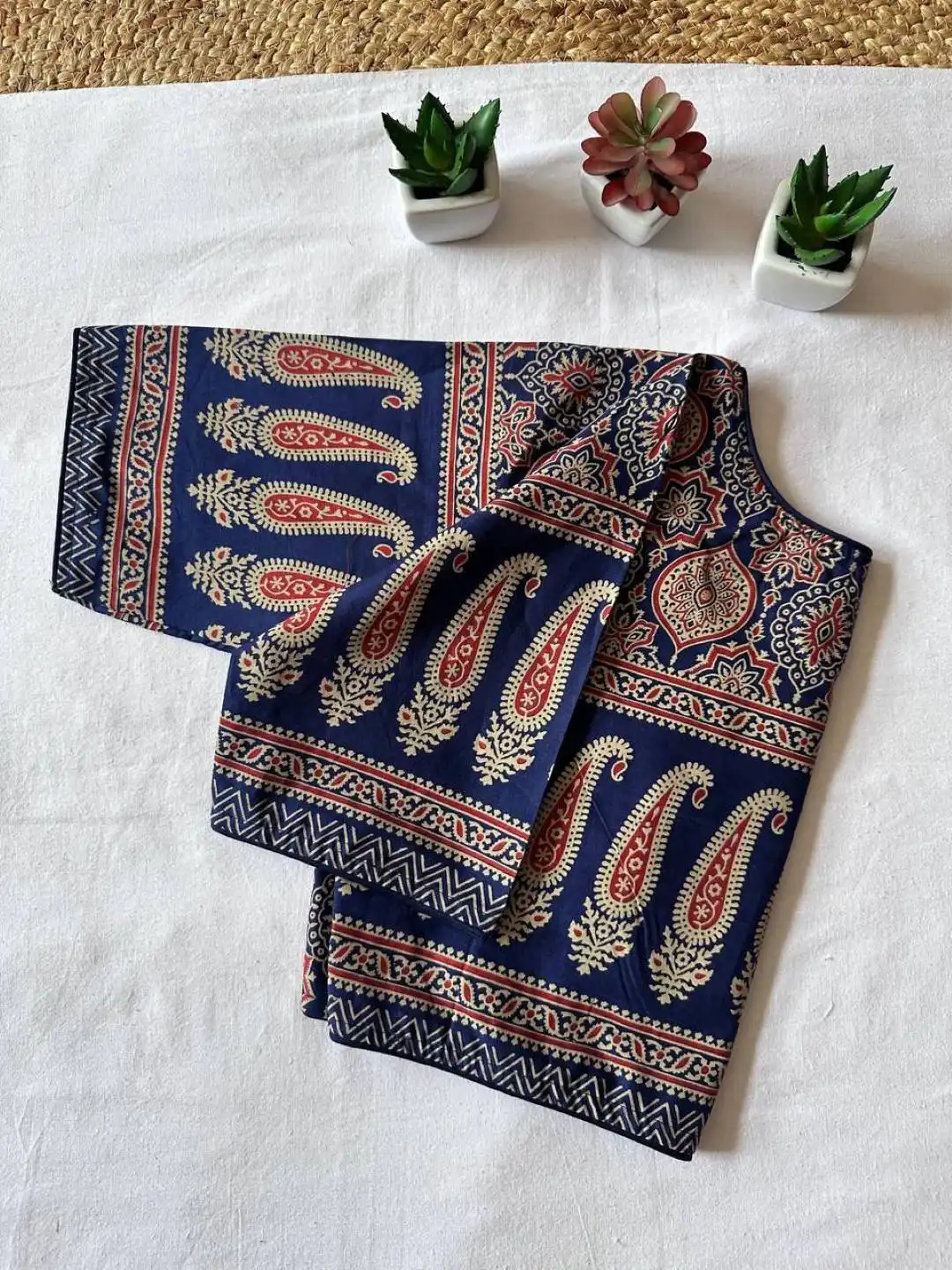 Blouse: Ajrakh Cotton Blouse | Handblock Designer | Height 15inch | Open Front Opening | Pattern BoatNeck Cum Regular | Non Padded | Non Lining