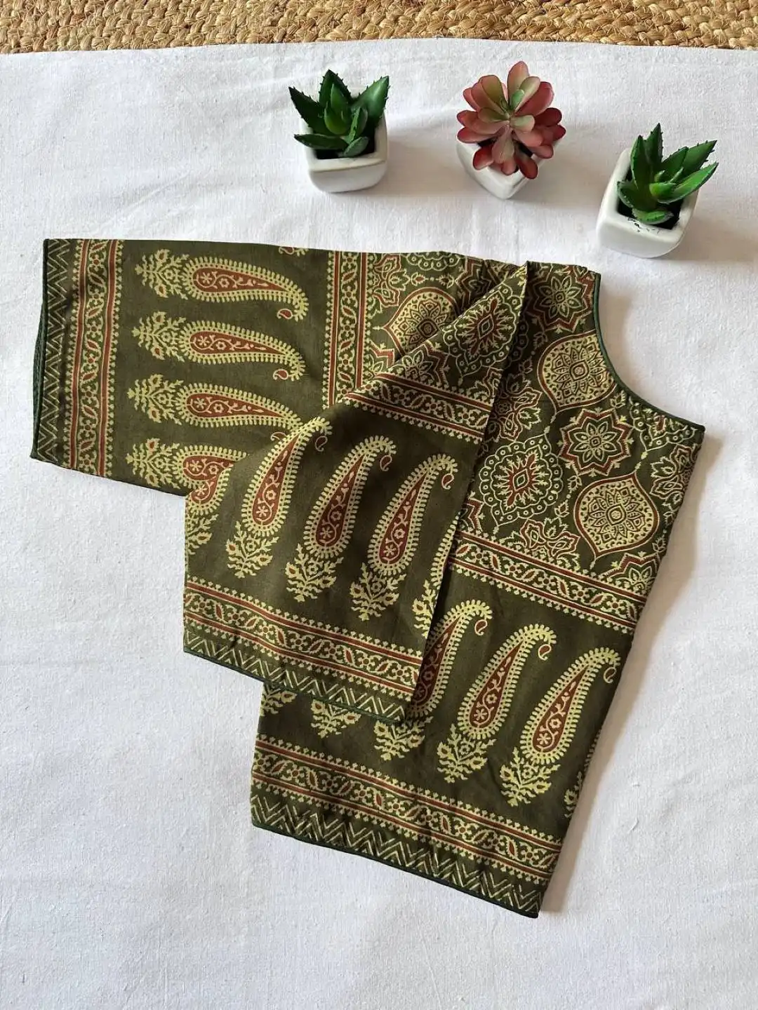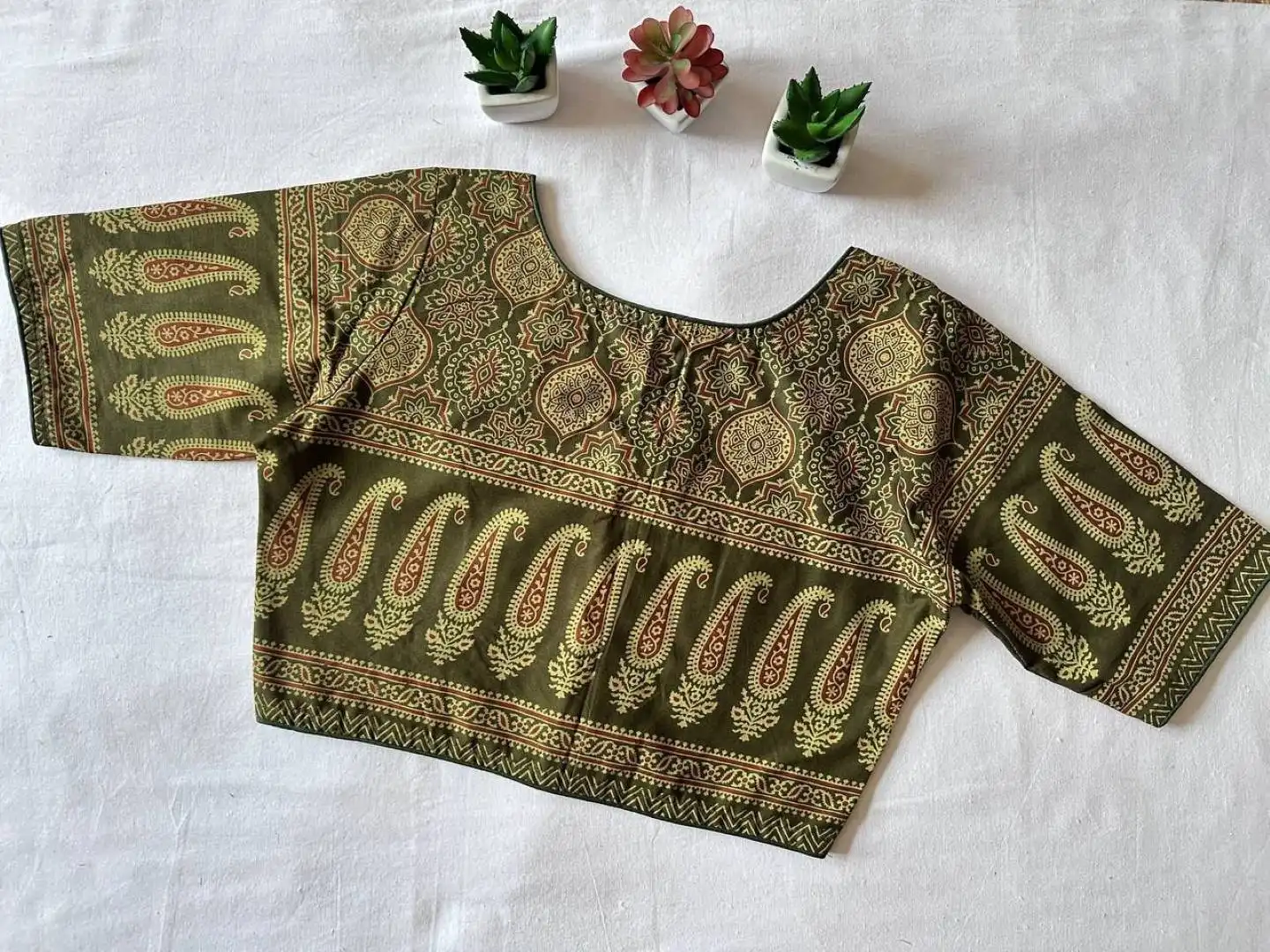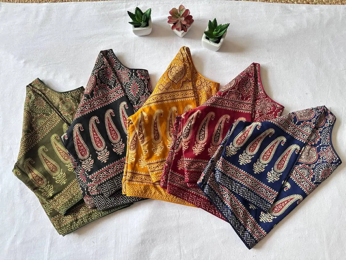 Blouse: Ajrakh Cotton Blouse | Handblock Designer | Height 15inch | Open Front Opening | Pattern BoatNeck Cum Regular | Non Padded | Non Lining