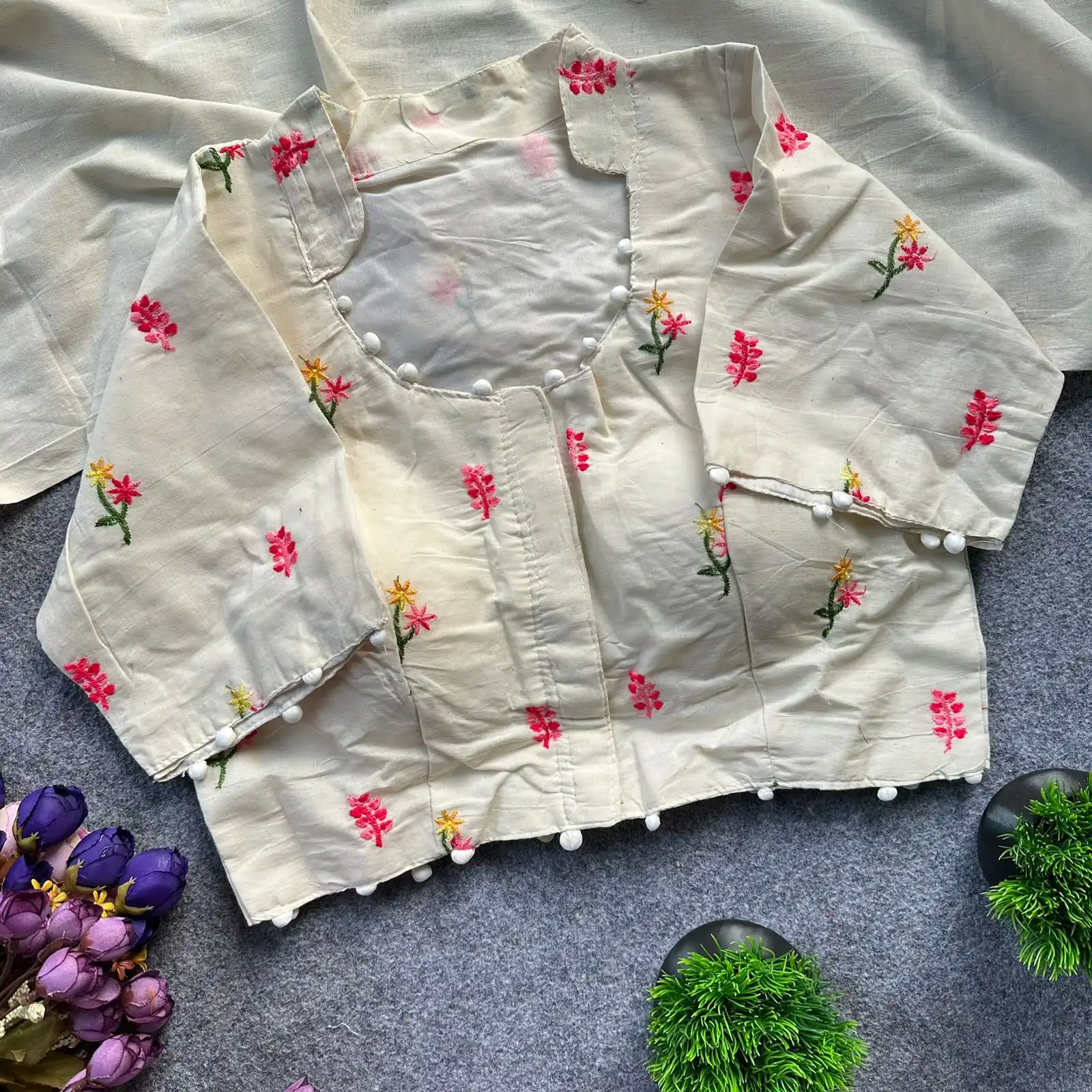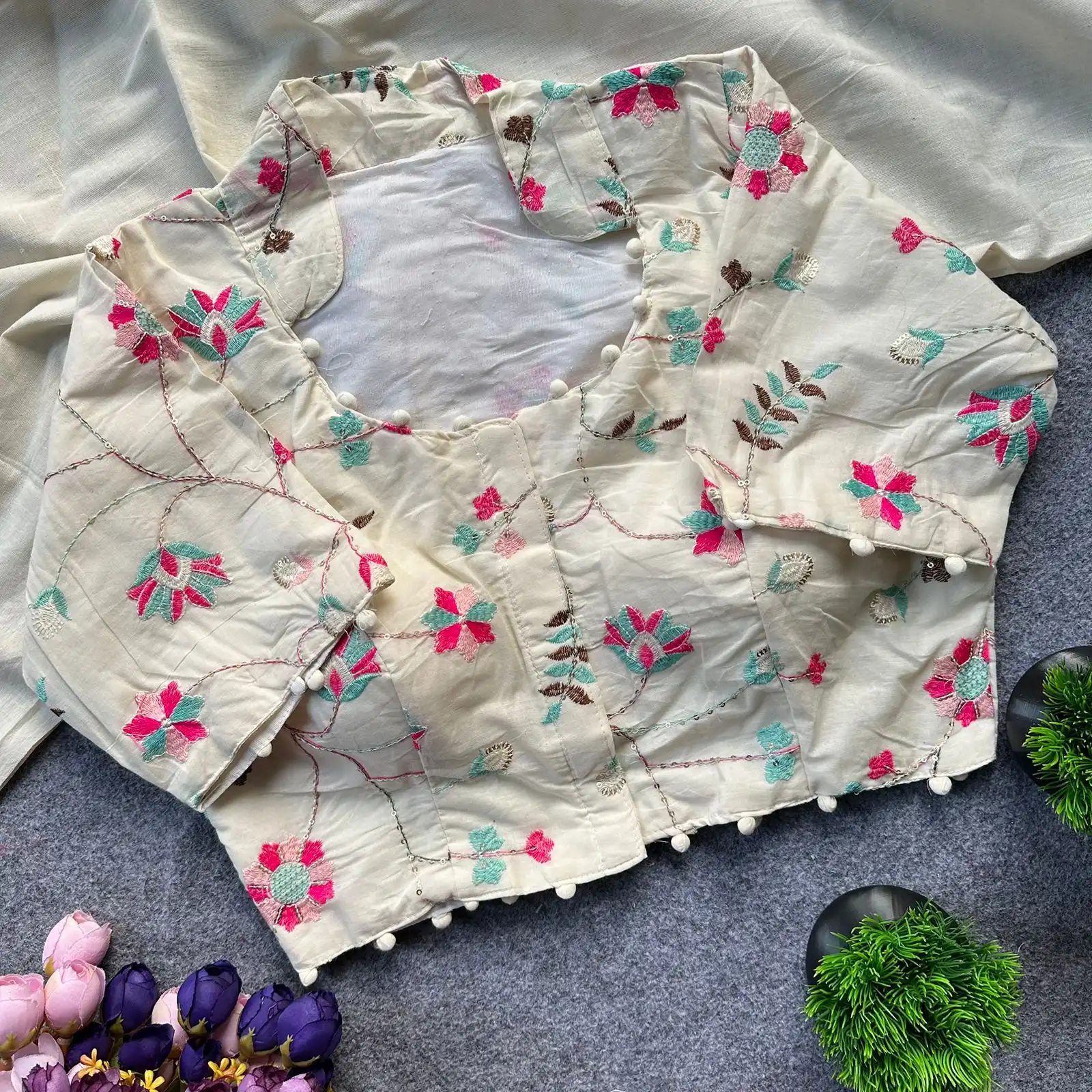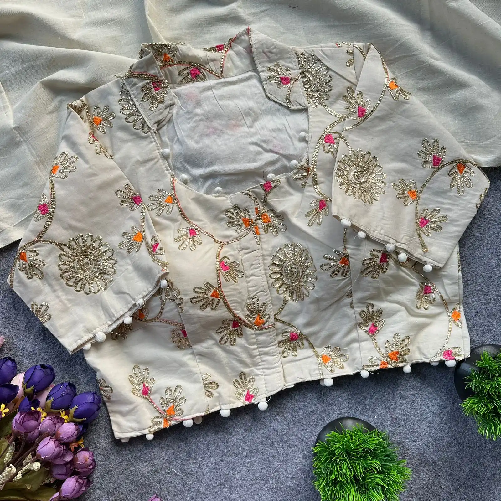 | Blouse: | Pure Camric Khadi Cotton | Multi Sequence Thread n Embroidery | Chinees Collar | 10 inch Sleeves | Front Open with Hook | 15 Inch Height |