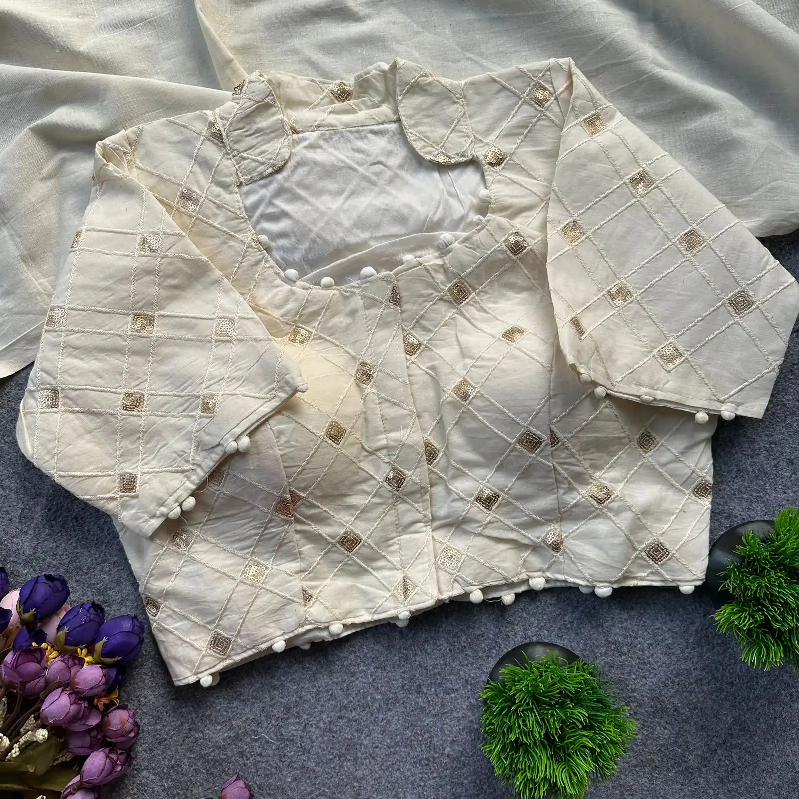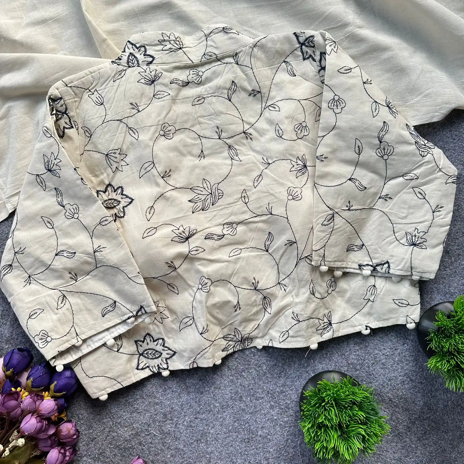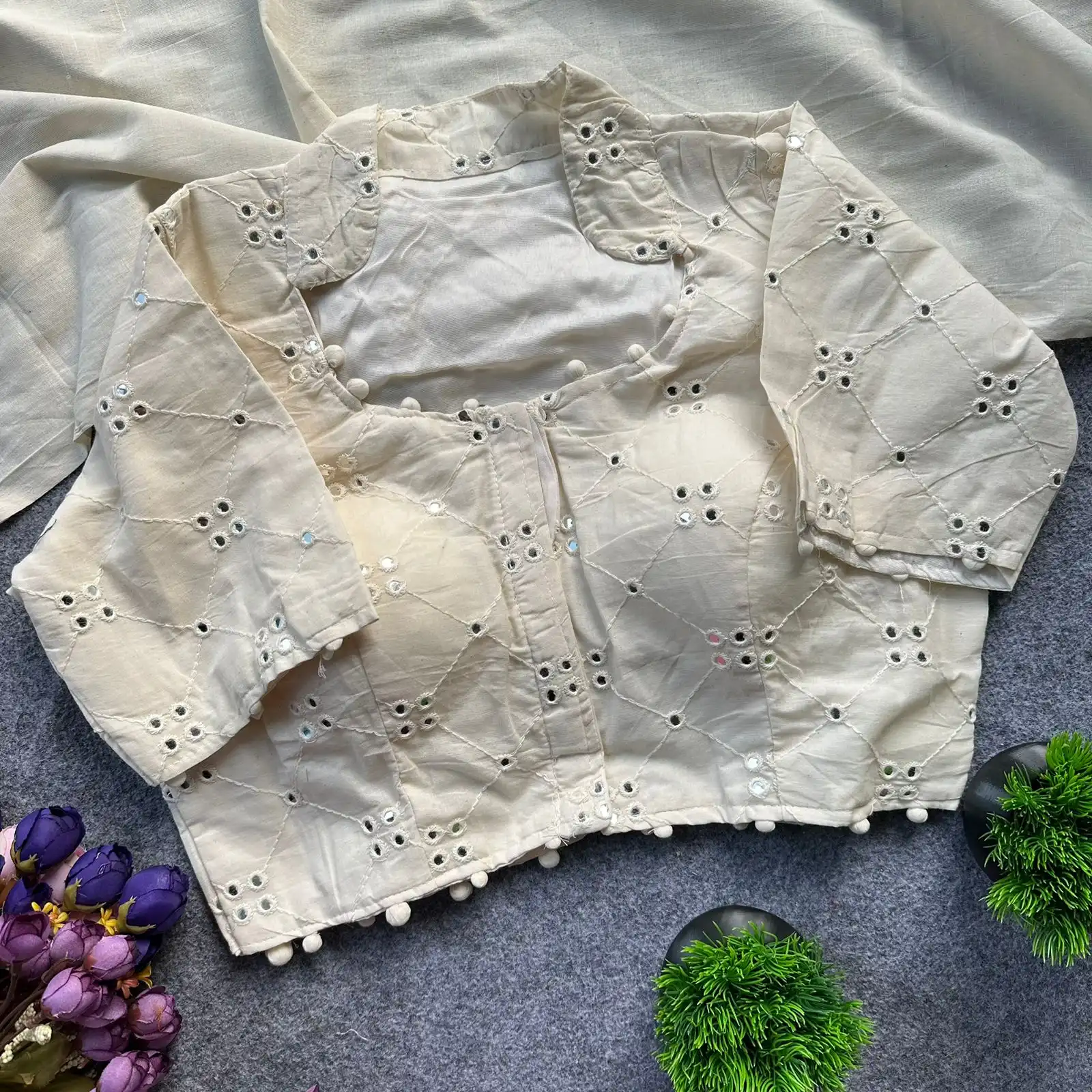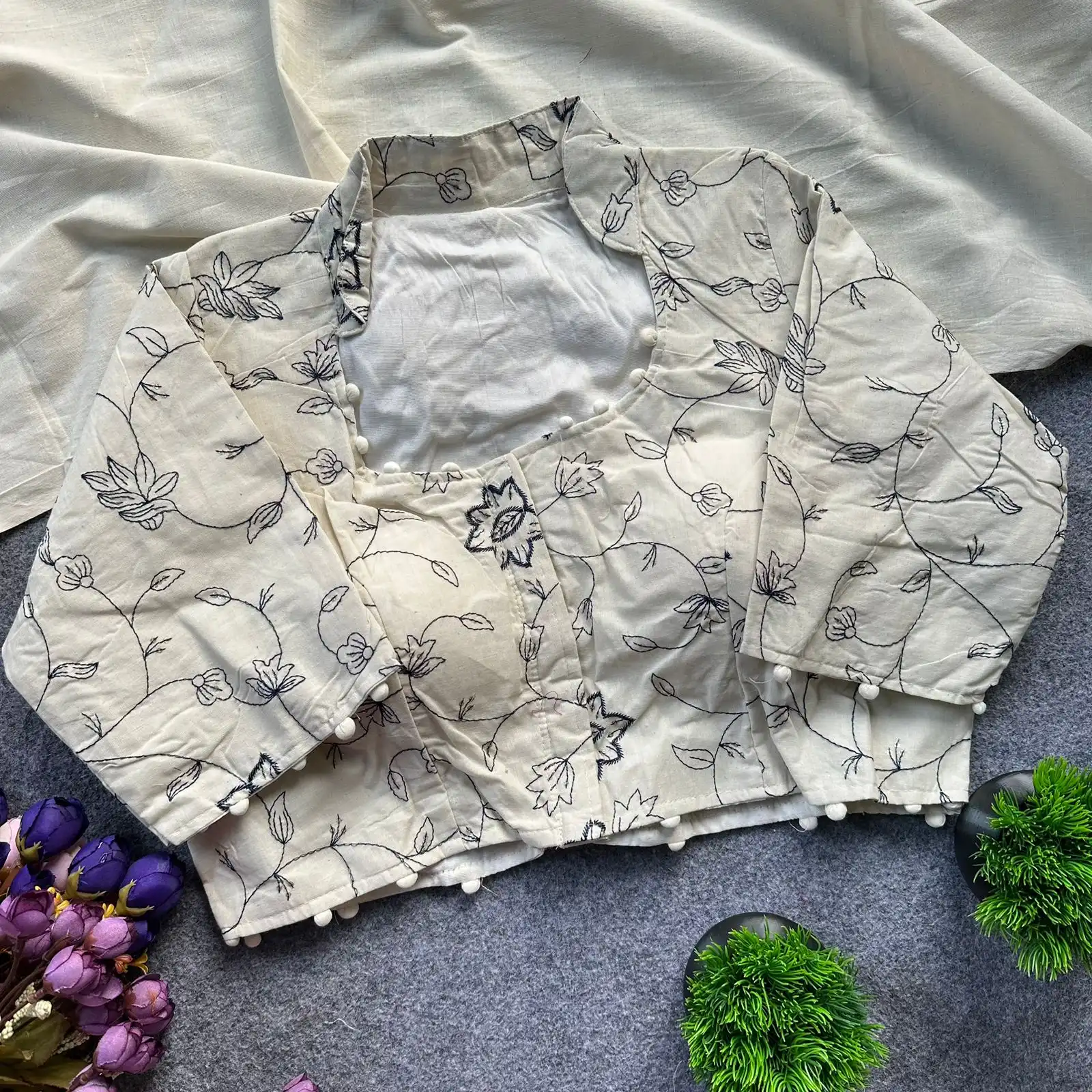 | Blouse: | Pure Camric Khadi Cotton | Multi Sequence Thread n Embroidery | Chinees Collar | 10 inch Sleeves | Front Open with Hook | 15 Inch Height |