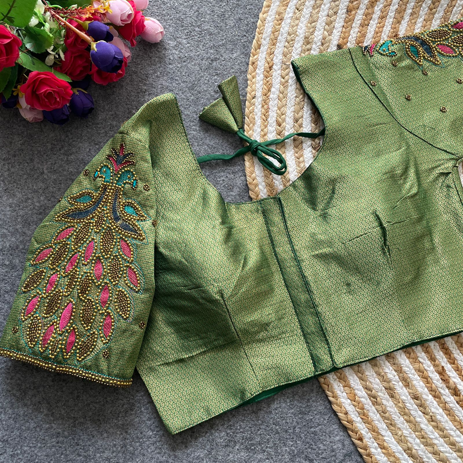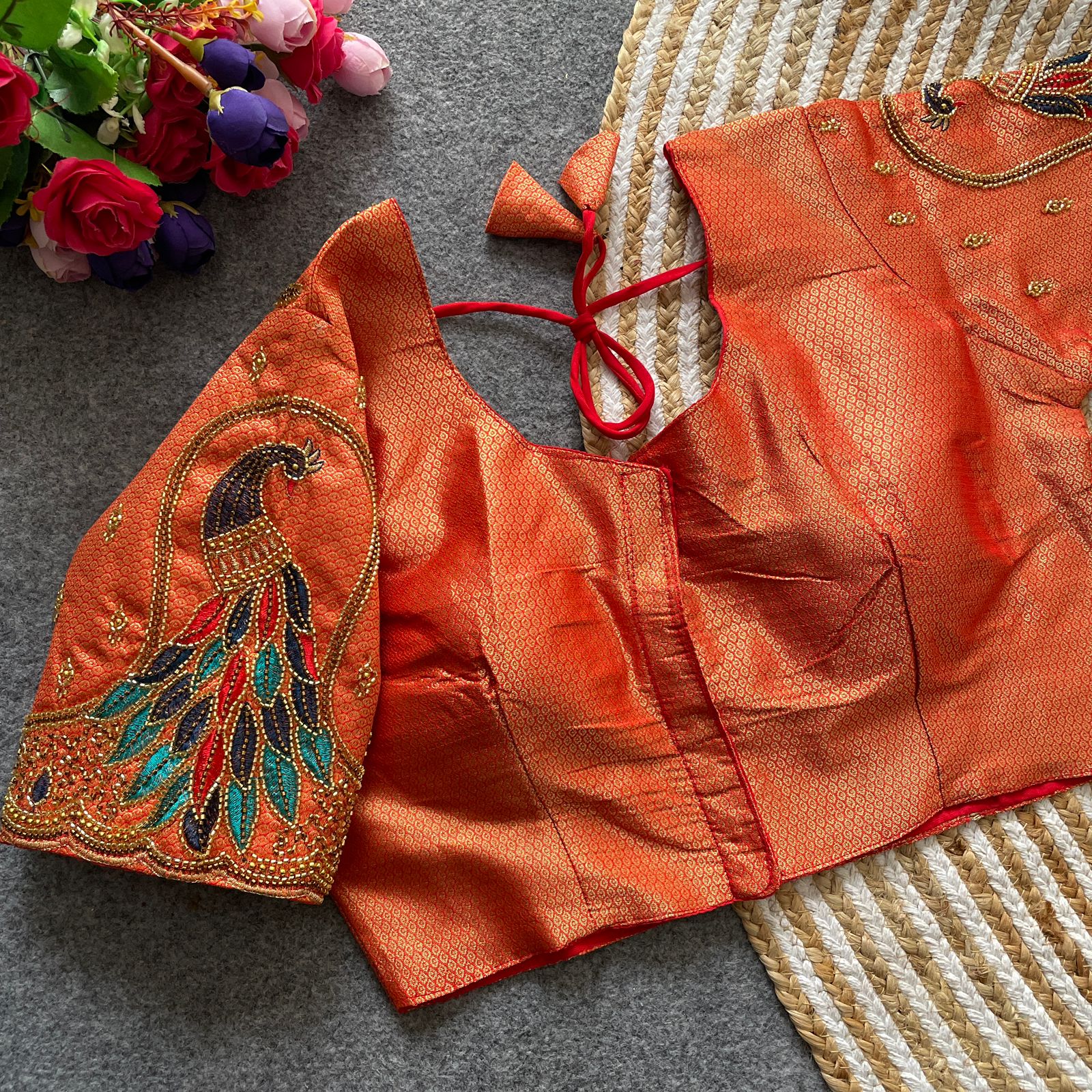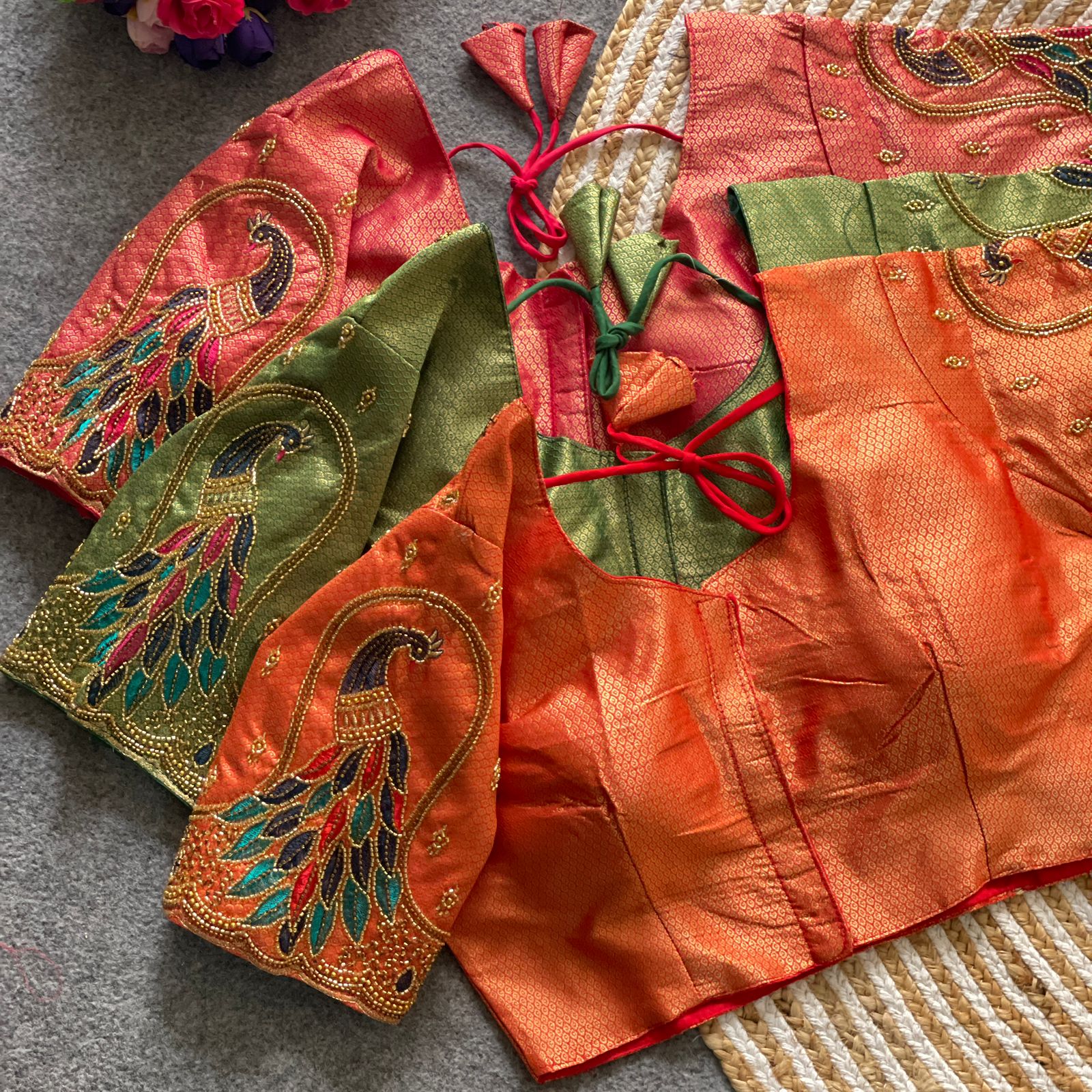 Blouse Heavy 𝙱𝙰𝙽𝙰𝚁𝙰𝚂𝙸 Jecquard Silk With Tricot Fuising, DESGINE:- Heavy Stitching Heavy Padded Handmade Hooks With Beautiful Latkans Front open Style, Heavy Handwork, Sequence & Codding Thread Work, SLEEVES:- 12” Sleeves Attached, SIZE:-40” Ready ulter upto 42 Inch.