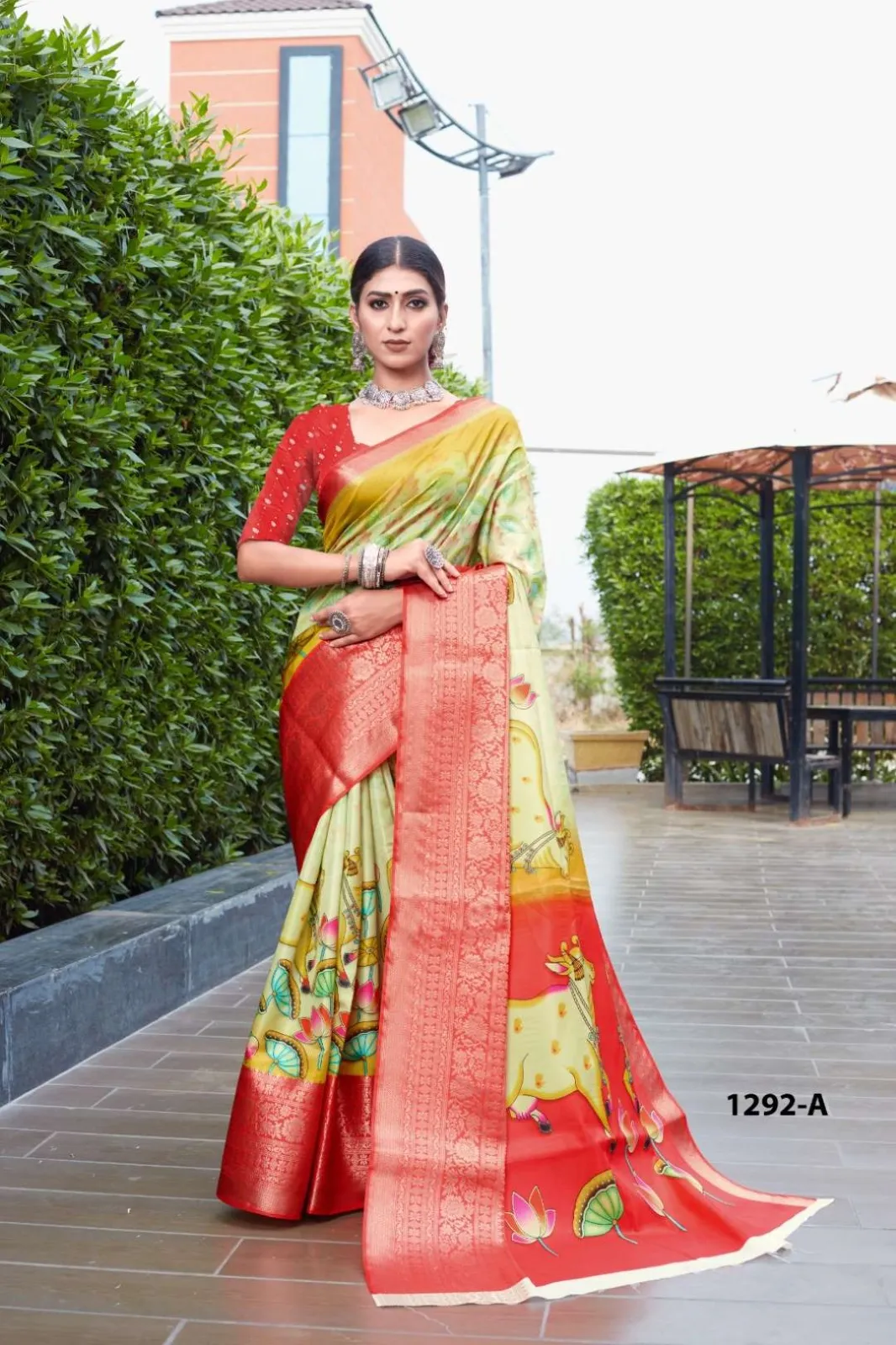 Saree: Soft Lichi Saree With Digital Print Big Jacquard Border