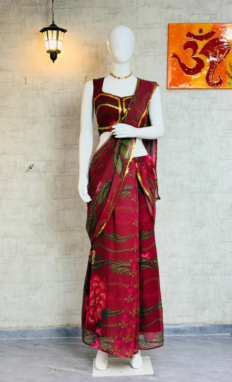 | Saree | Faux Georgette , Work- Readymade free size stitched with draped attcched Pallu |