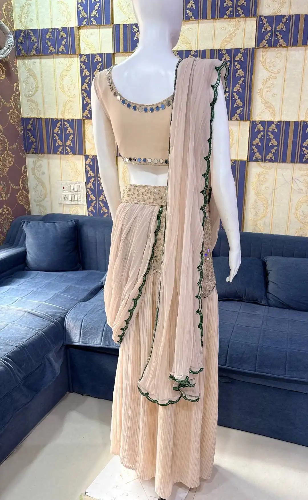 | Saree: | Premium Faux Georgette Work: Real mirror Work, Crushed & Ready to wear with Attached Pallu Size: Stitched Saree (XL) with 2-inch margin up to 44 size |