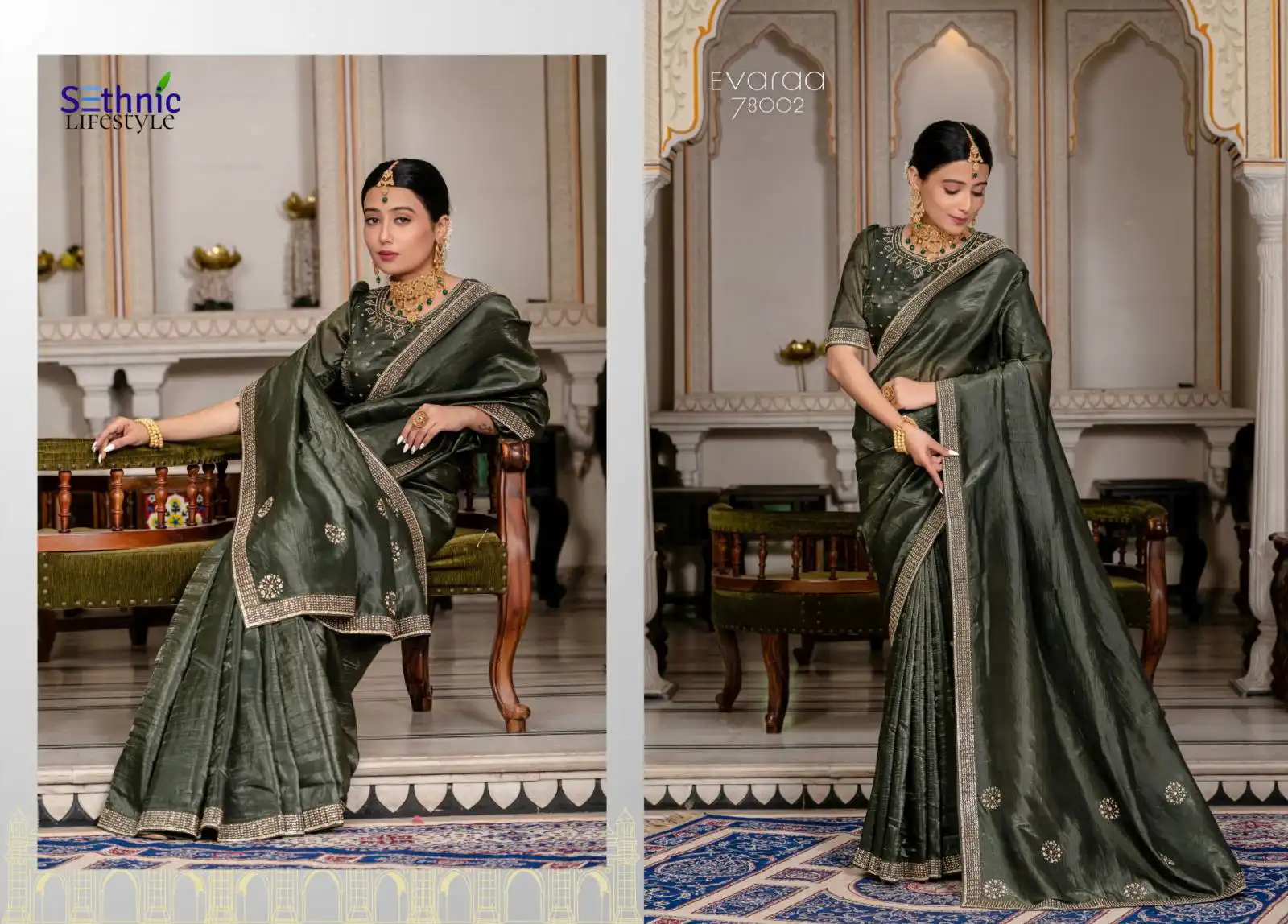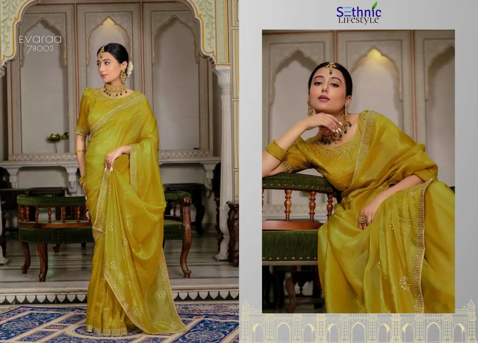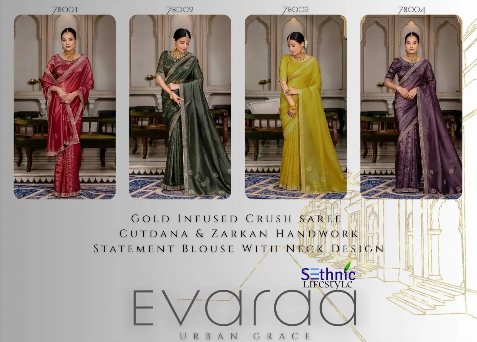 Sethnic Evaraa Gold Crush Saree With Zarkan Work