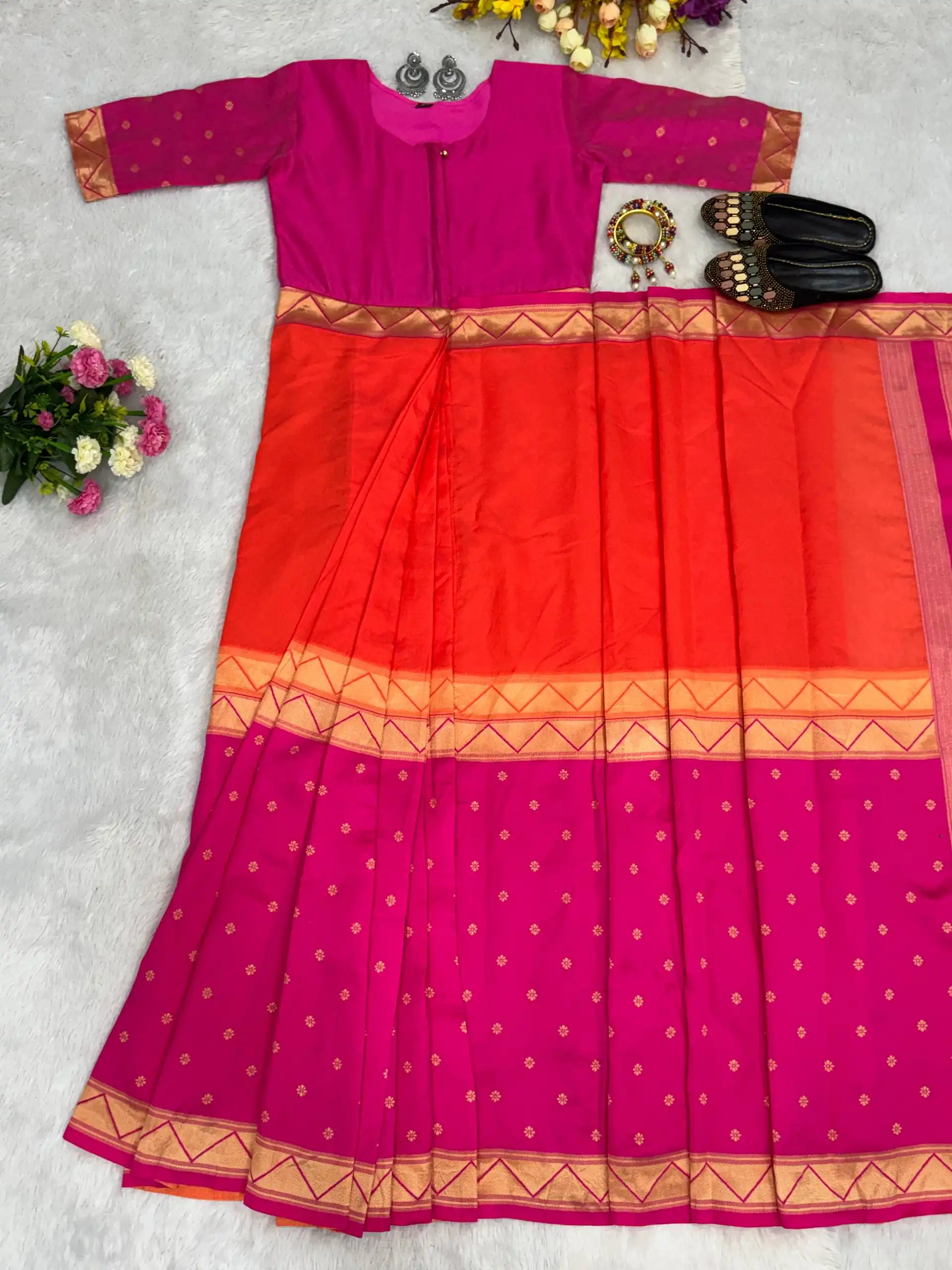 | Gown Saree: | Mysore Silk | Inner: Micro Cotton | Work: Jequard | Length: 56-58Size: M(38), L(40), Xl(42), 2XL(44), (Upto 3xl margin) |