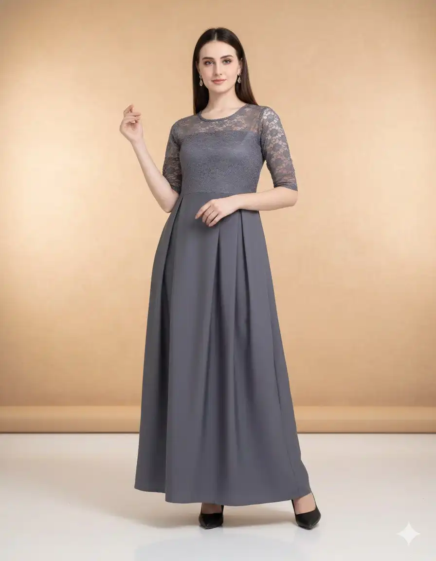 | Gown: | Pattern: Net | Georgette with crepe inner Length: Regular | Neck : Round neck Sleeve Length: 3/4 sleeve Stitch: full stitching |