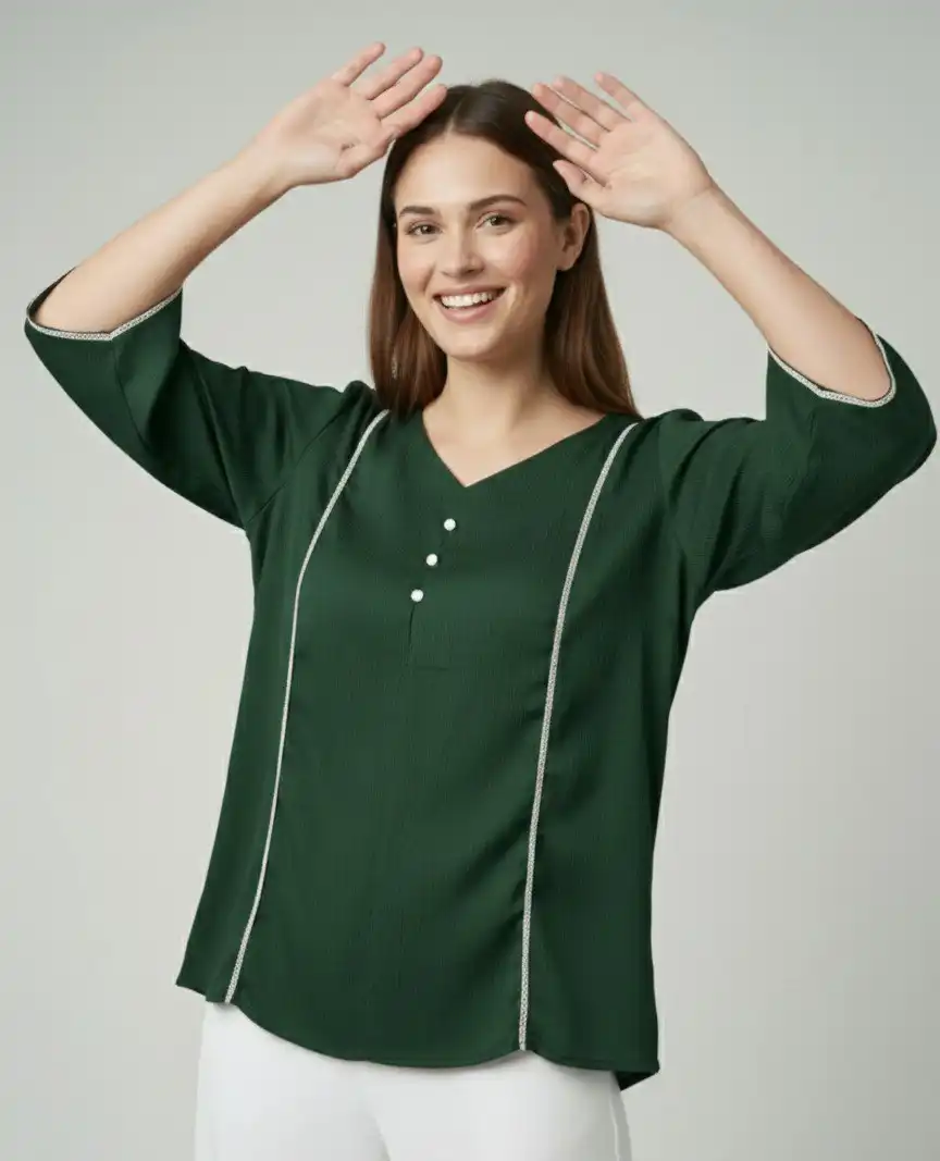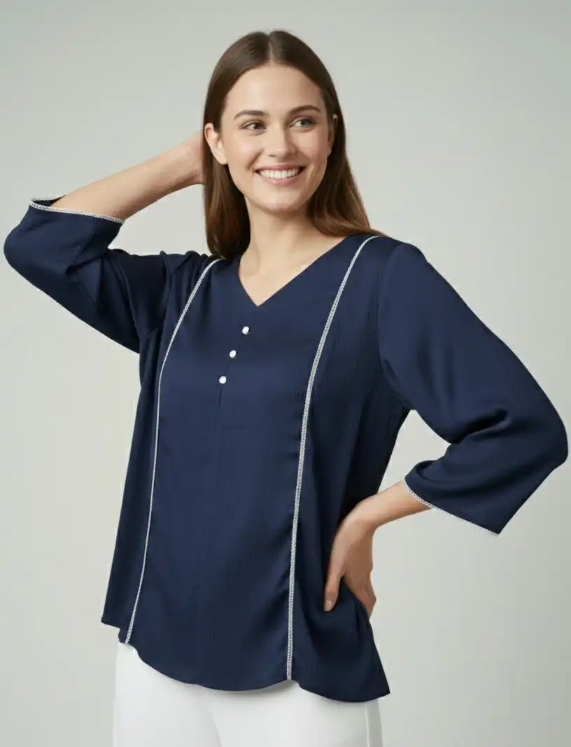 | Top: | Delta Silk | Length: Regular | Pattern: Soild | Neck: V- Nack | Sleeve Length: 3/4 sleeve | Bust : M(38), L(42), XL(46), 2XL(50) | Length: M(26), L(26), XL(27), 2XL(28) |