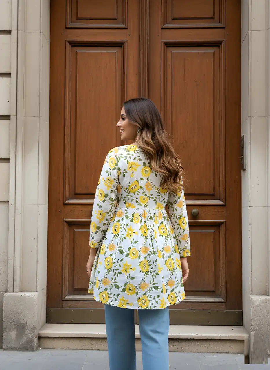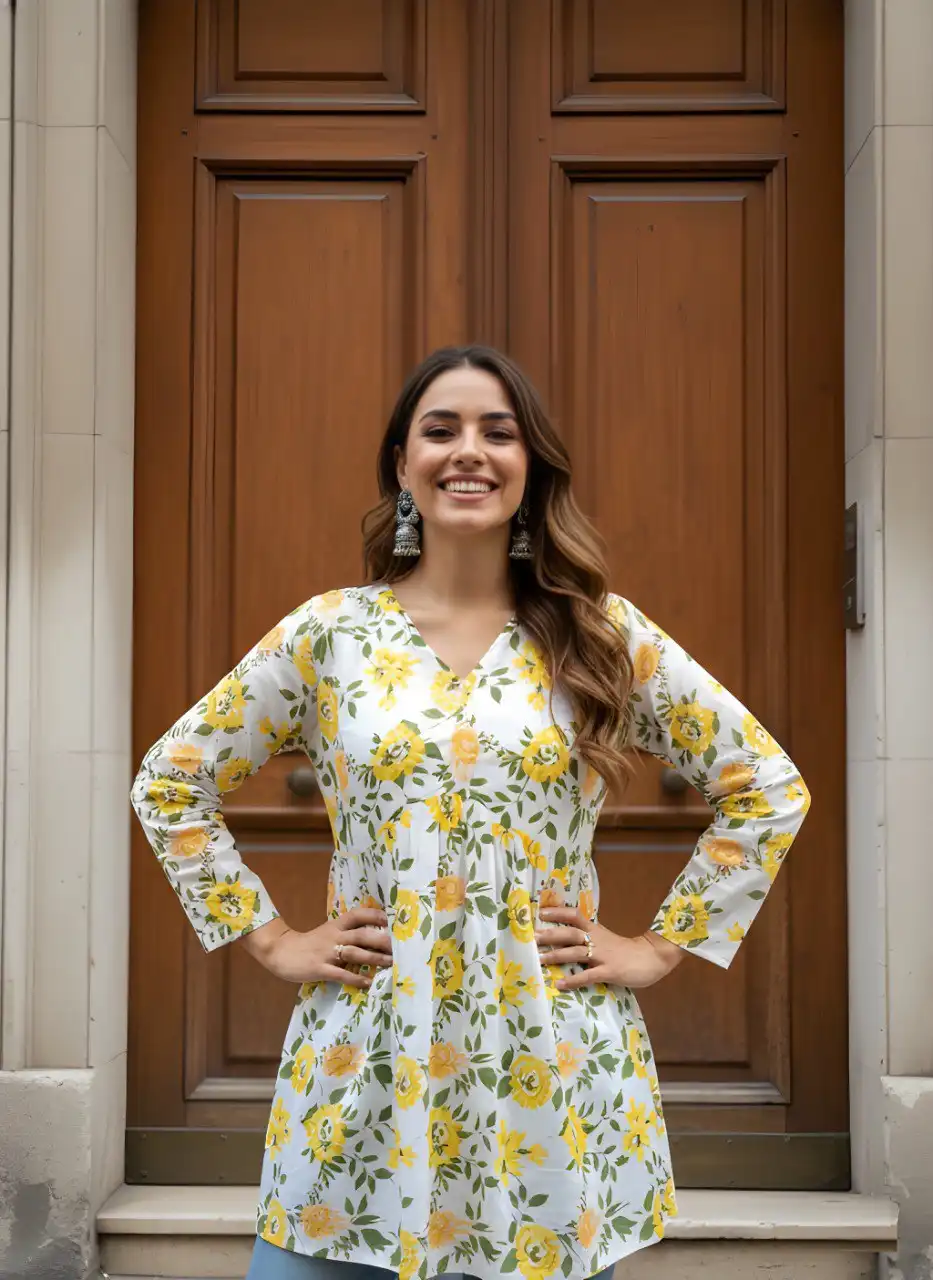 | Top: | Cotton | Pattern: Printed | Length: Regular | Neck: V Neck | Sleeve Length: Full sleeve | Bust: S(36), M(38), L(40), XL(42), 2XL(44) | Length: S(26), M(26), L(28), XL(28), 2XL(28) |
