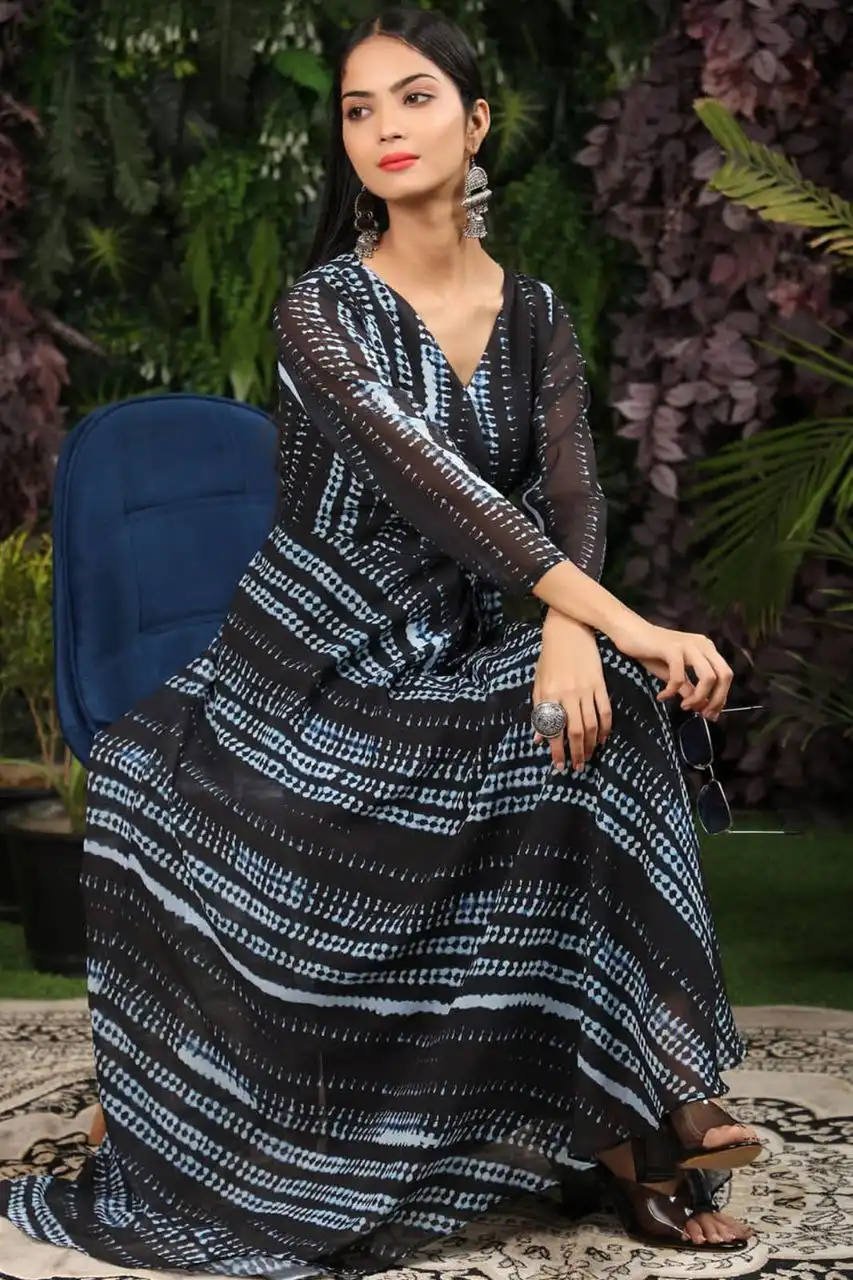 Gown: | Georgette with crepe inner | Length: Regular | Pattern: chain Printed | Neck : V neck | Sleeve Length: 3/4 sleeve | Length: M(50), L(52), XL(52), 2XL(52) |