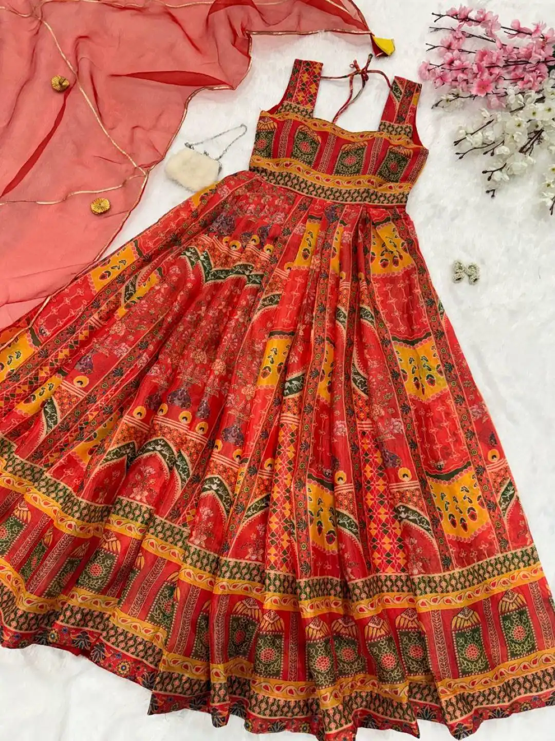 | Gown : | Digital Printed Jimmy Organza Silk With Huge Flair Sizes – XS, S, M, L, XL (Margin Available For 44) |