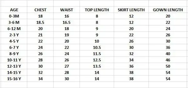 Size:1-2 yrs | 3-4 yrs | 5-6 yrs | 7-8 yrs | 9-10 yrs | 11-12 yrs | 13-14 yrs | 15-16 yrs (1month to 16 year)
