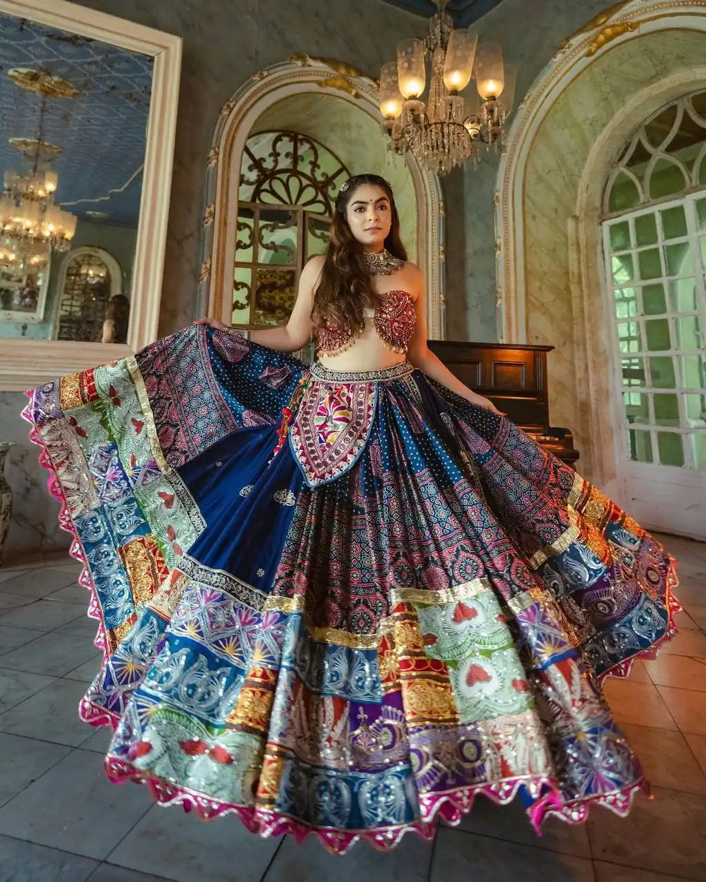 Lehenga: | Soft Butter Silk Work : Fancy Digital Print Work & Real Mirror Work Inner : Micro Cotton Length : 42-44 Inch Flair : 4 mtr Type : Stitched |