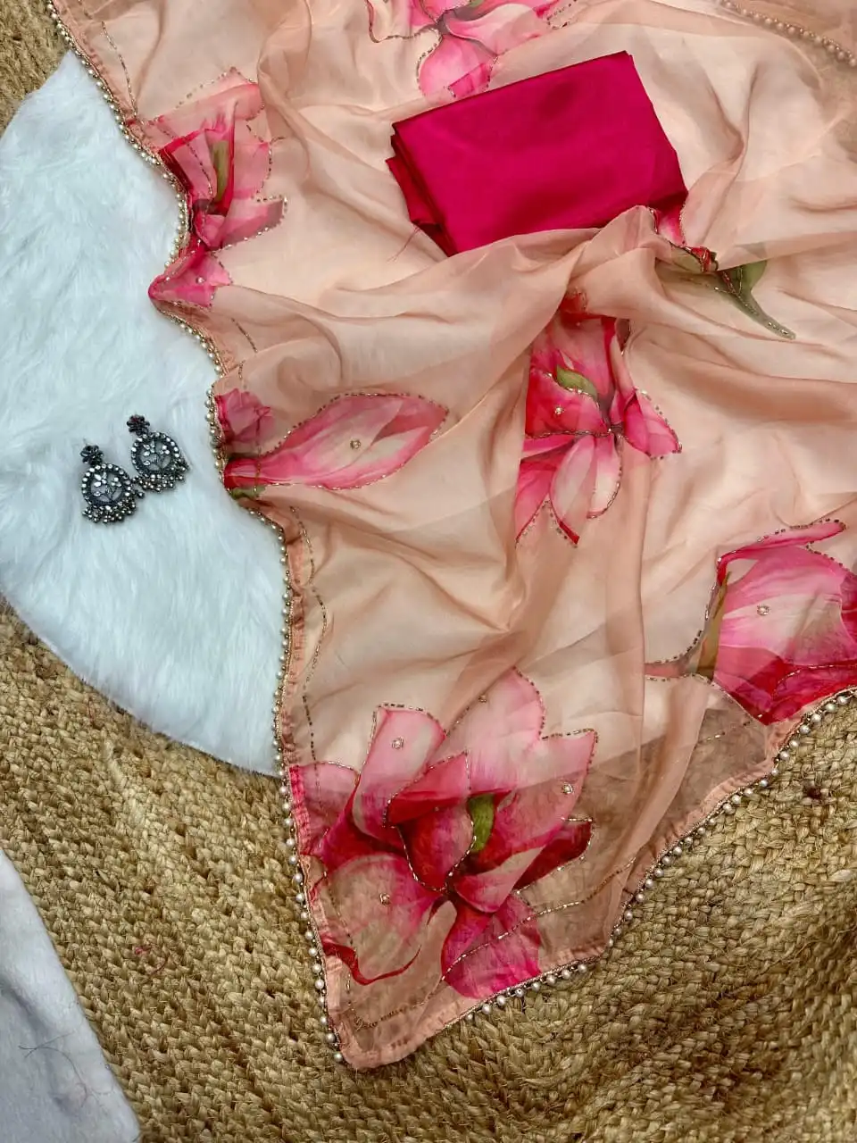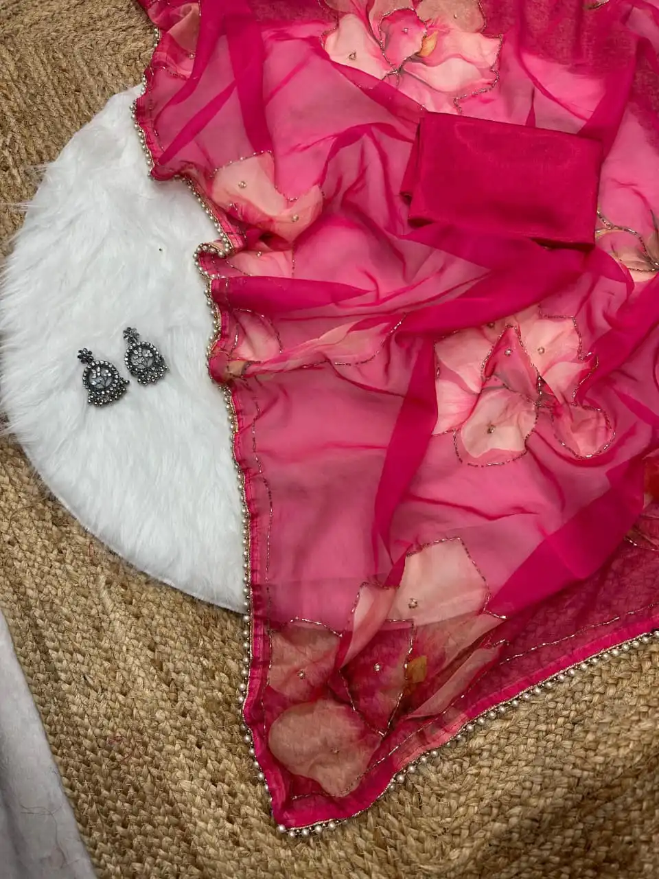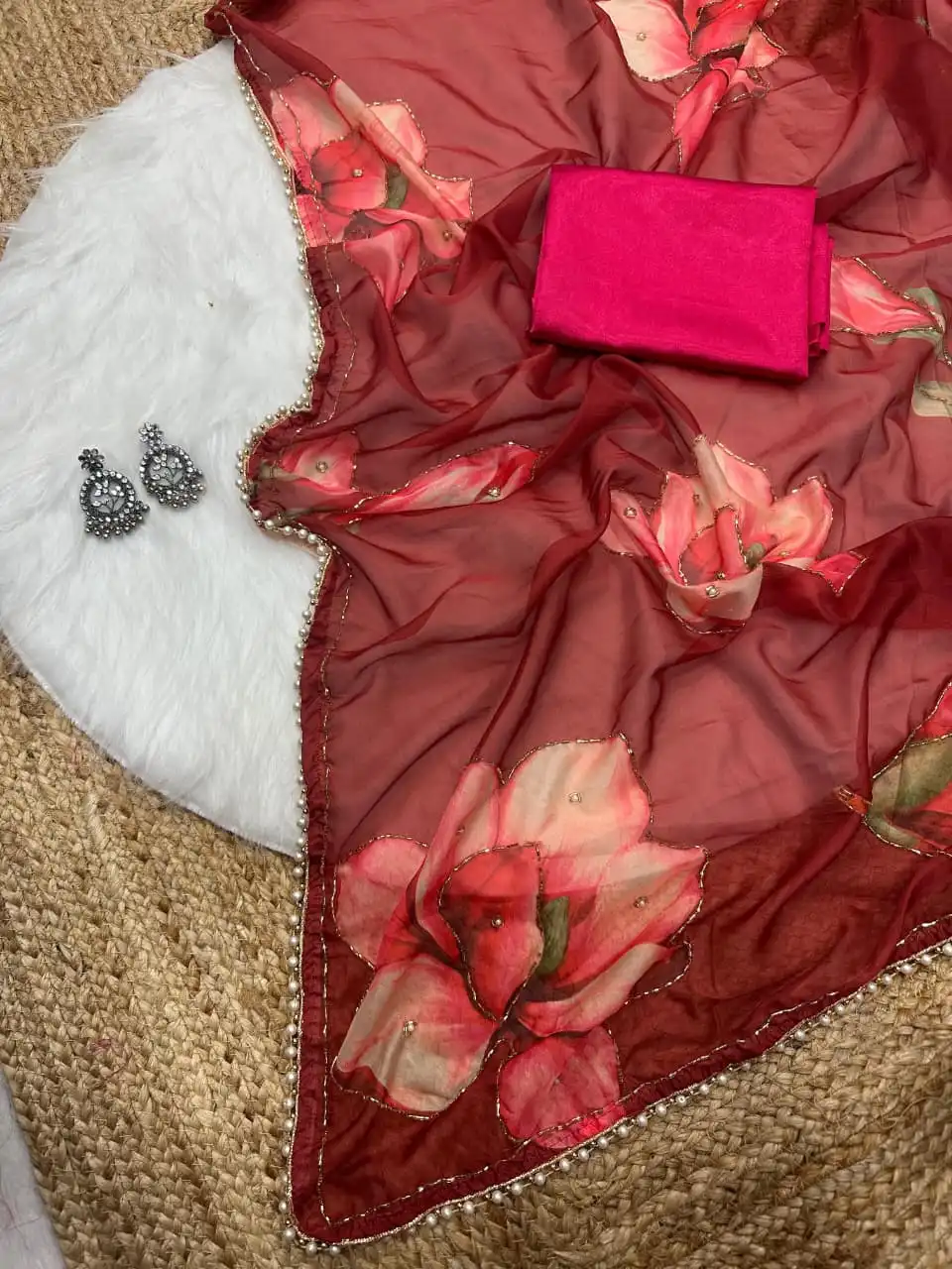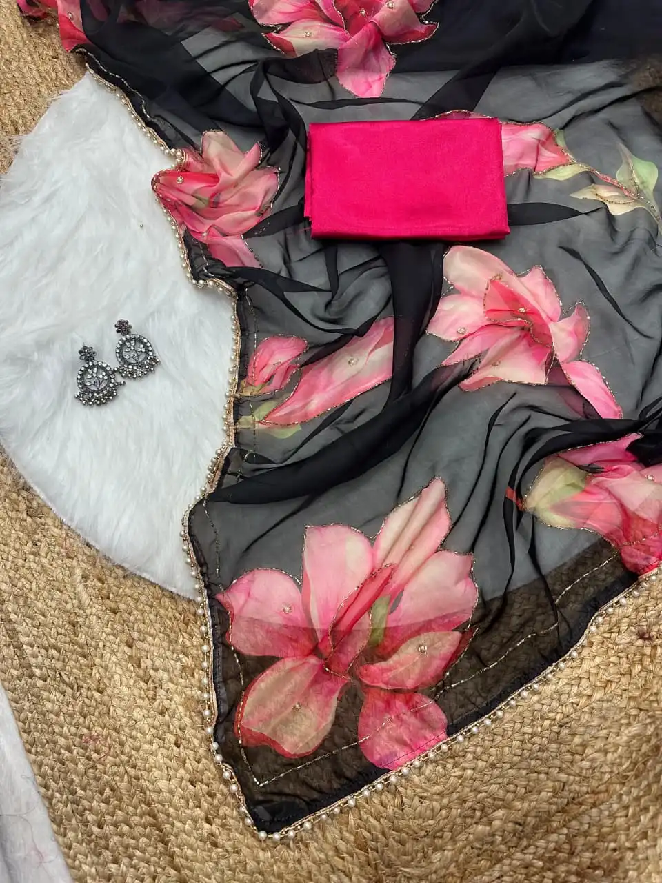 Saree:Soft georgette silk | Work:- beautiful val moti handwork with moti lace | Flowers digital print |  Length :- 5.5 Meter.