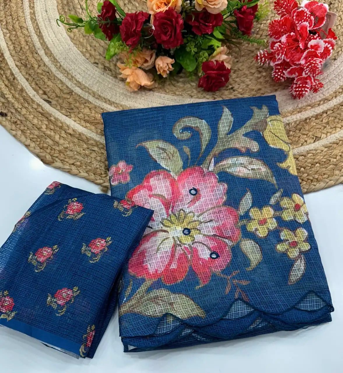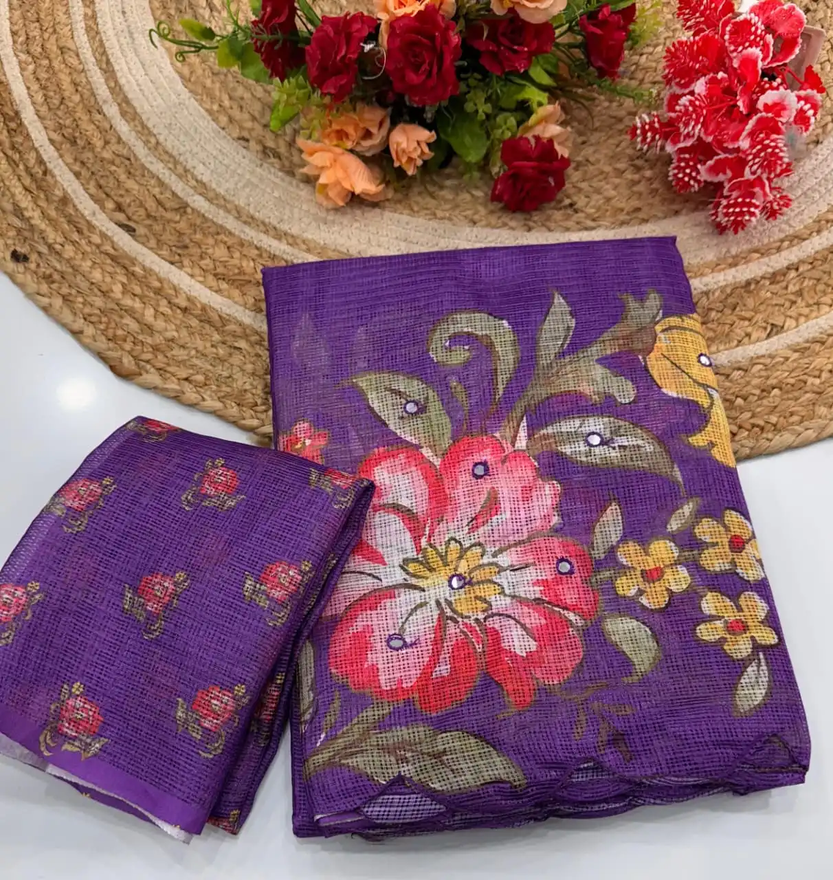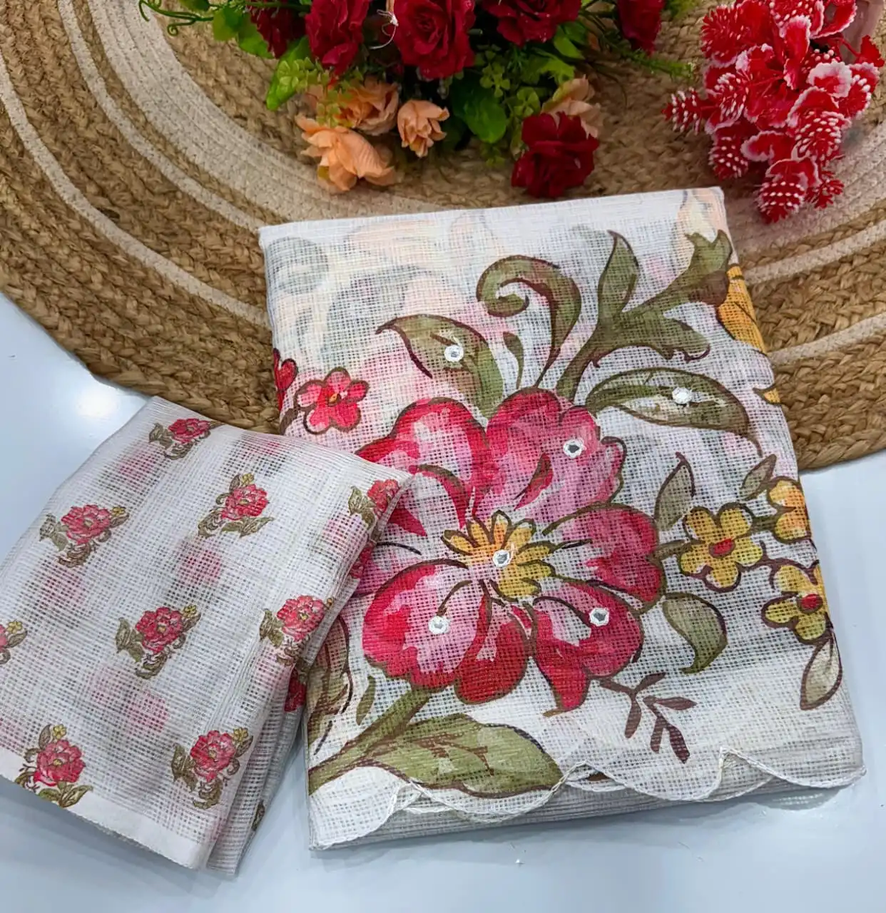 Saree: | Soft kota chex with floral digital print with embroidery foil mirror with scalloped cutwork border |