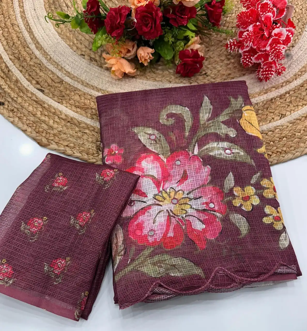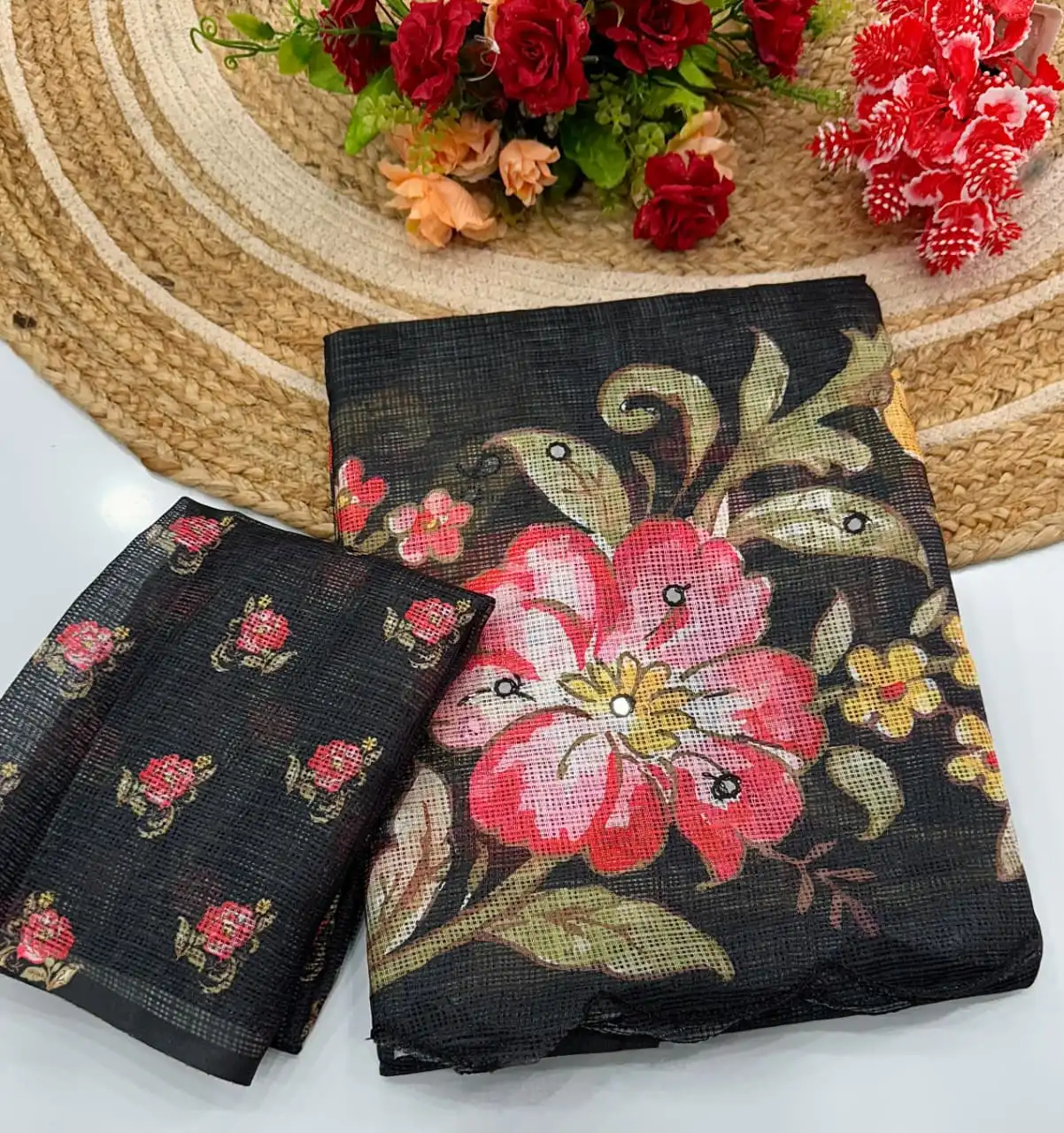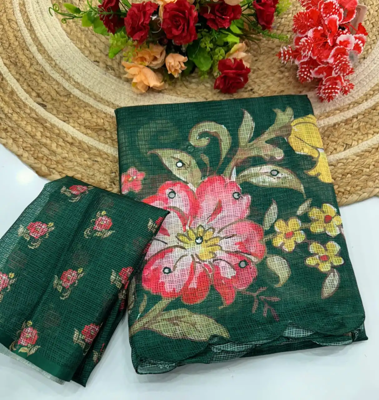 Saree: | Soft kota chex with floral digital print with embroidery foil mirror with scalloped cutwork border |