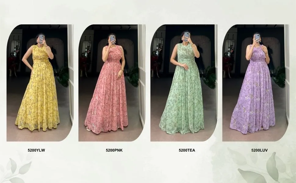 | Gown | Weightless Marbal, Work : Floral print, Chest : 40″ (Inside 2 inch extra margin available so you can adjust support up to 42 for your body comfort), Waist : 38, Length : 57, Flair : 3.40 Meter, Lining : silk (full upto bottom) |