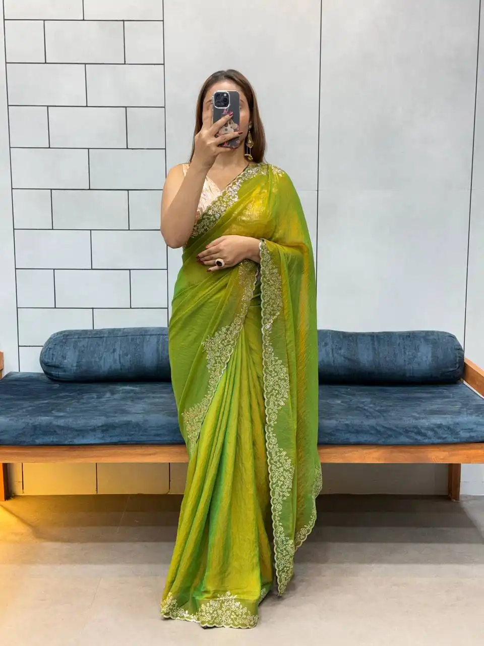 Saree: | MOSS FENDY SPACE SILK | SOFT RICH GOLDEN MOSS FENDY FABRICS WITH PANEL CUT WORK DIAMOND FLOWER WORK | CUT 6.30 |