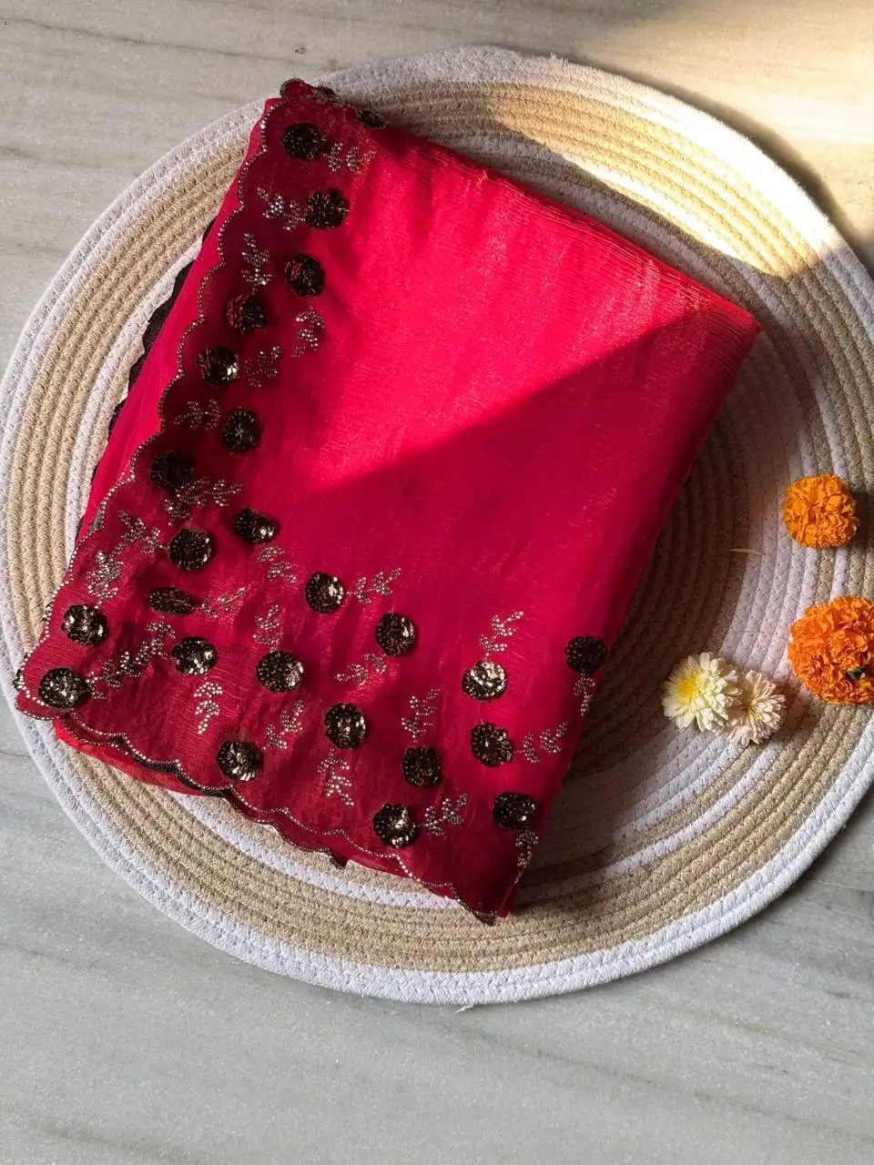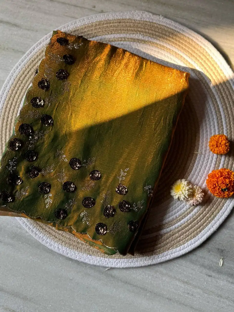 | Saree: | FENDY CHIFFORN SOFT TWO TONE ALONG WOTH DIAMOND CUT DANA ZARKHAND WORK WITH HANDWORK SEQUNCE BUTTA CUT 5.50 MTR |