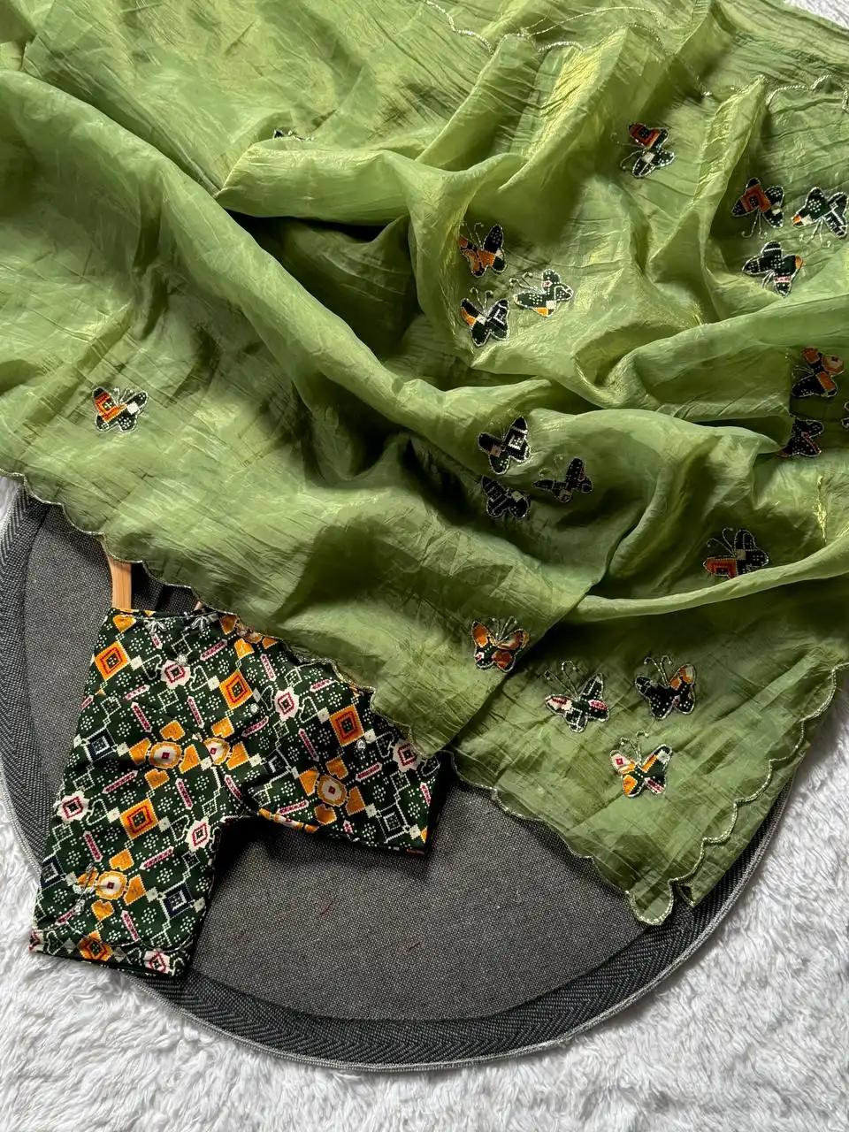 | Saree: | GOLD CRUSH SOFT TWO TONE FABRIC | ALONG WITH PATOLA HANDWORK CUTDANA BUTTERFLY BUTTA AND RICH PALLU BUTTERFLY PATOLA BUTTA |