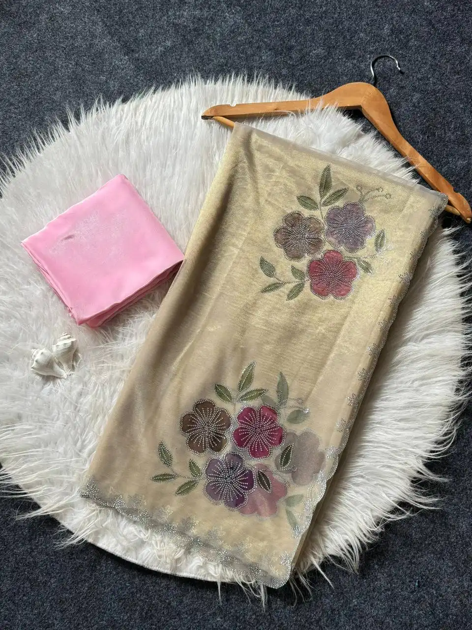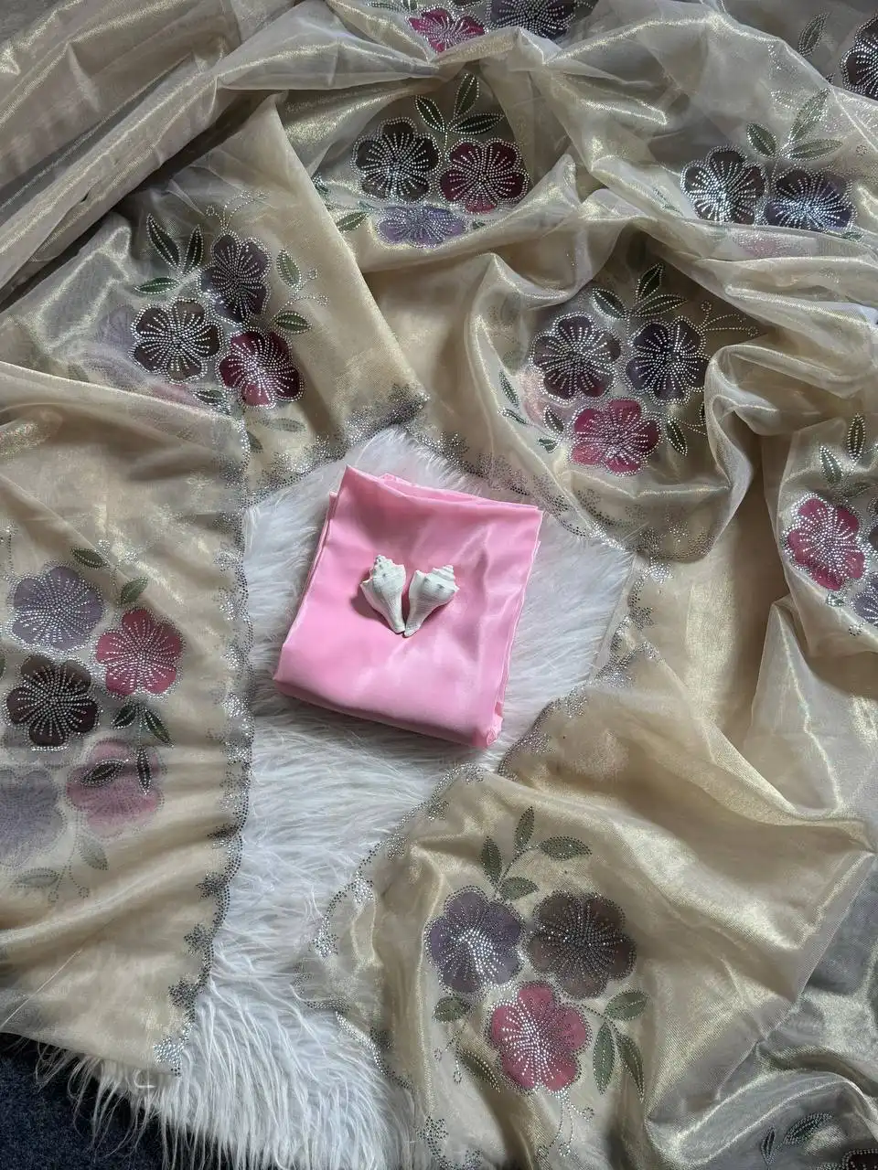 | Saree: | TWO TONE TISSUE SILK FABRIC ALONG WITH DIAMOND CUT WORK WITH BRUSH PRINT BUTTA WITH DIAMOND WORK CUT 5.50 |