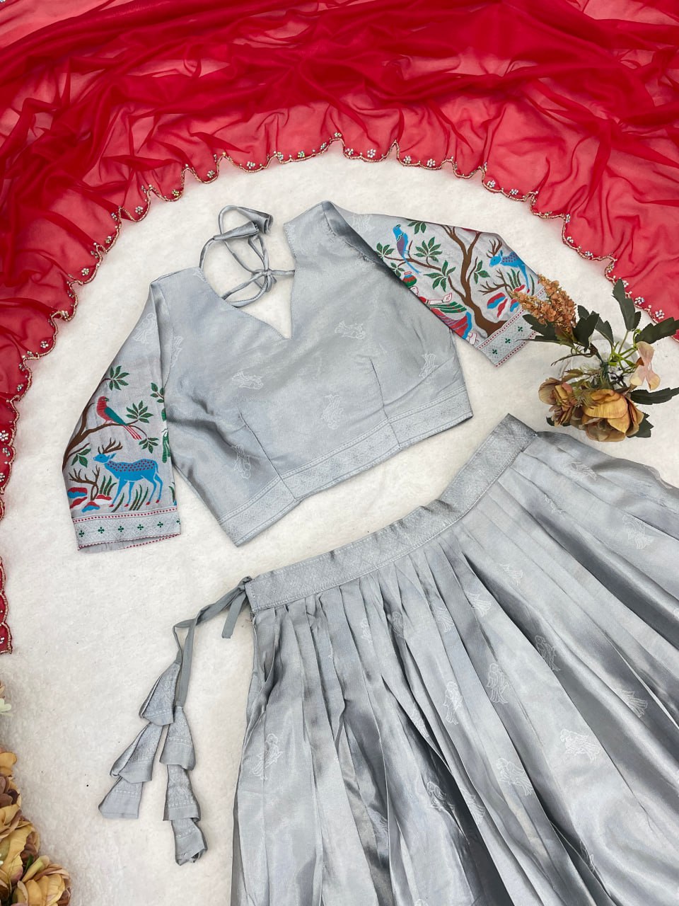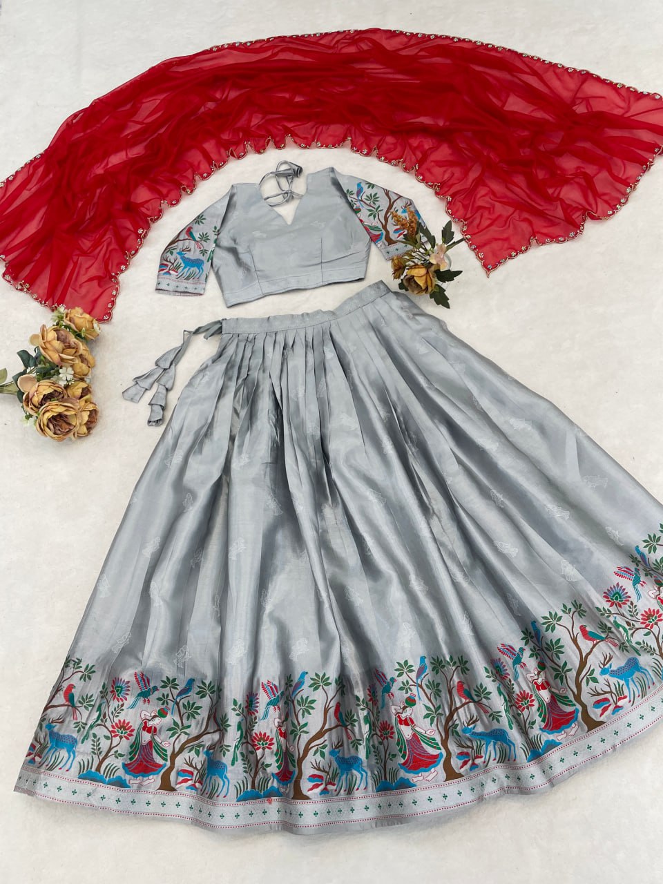 WMT 8130 Silver Silk Kalamkari Printed Border Lehenga Choli Wholesale |