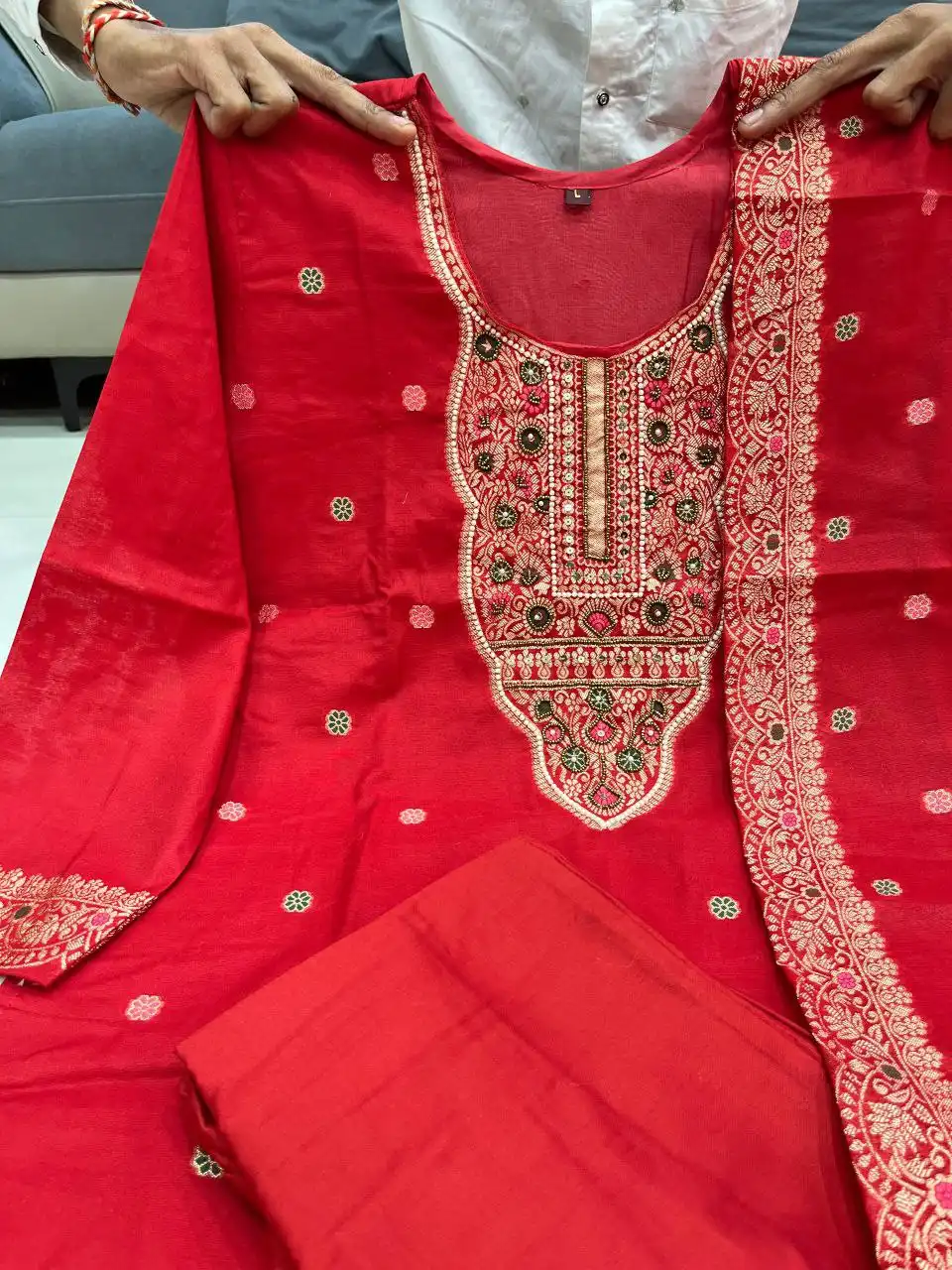 | Top: | Pure Banarasi | Hand zari Weaving Jacquard with Full Handwork Nack | Pure Cottton Lining |