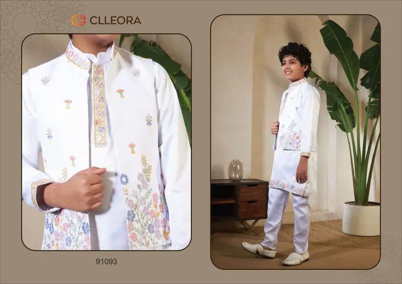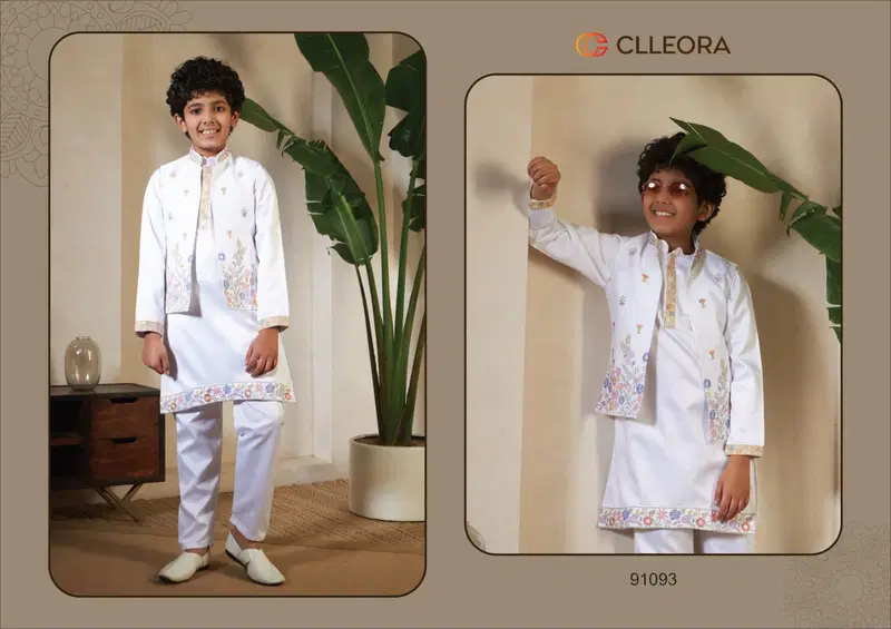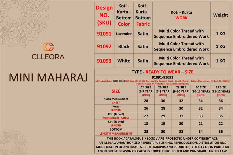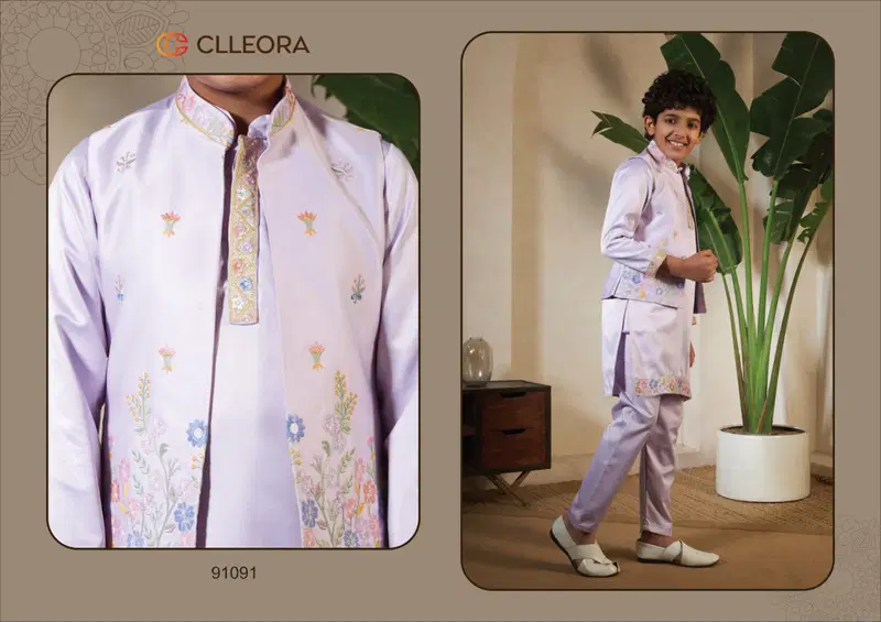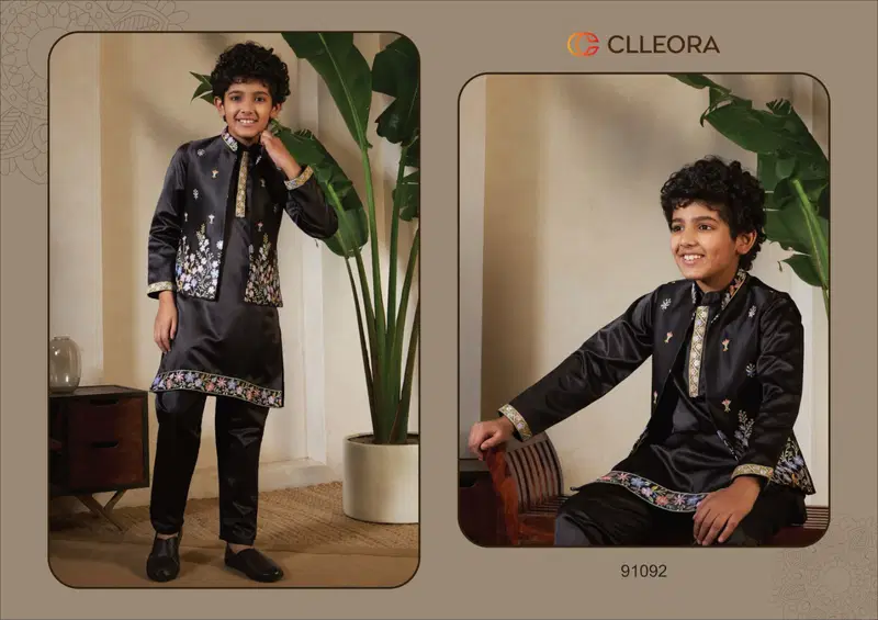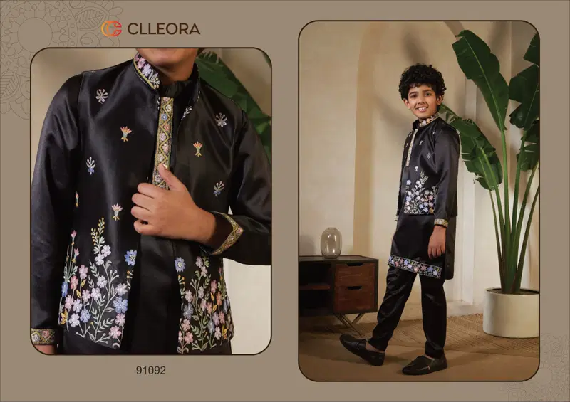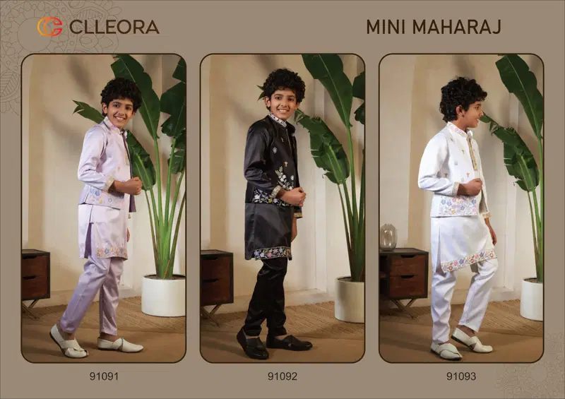 Clleora Mini Maharaj Satin Thread Embroidered Work Kurta Pant And Koti Wholesale