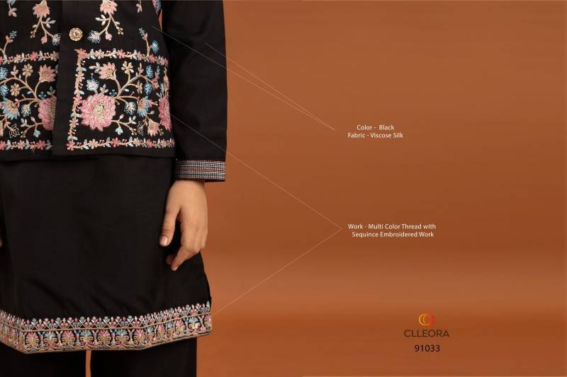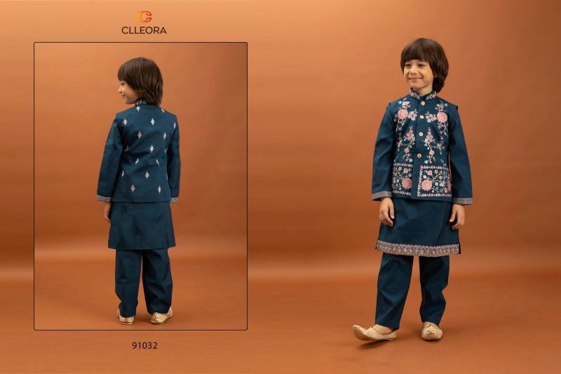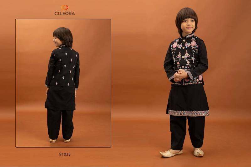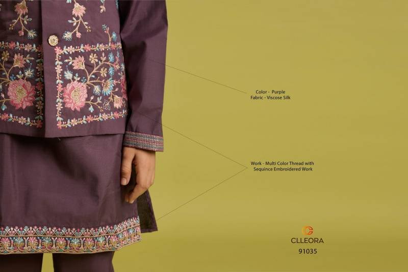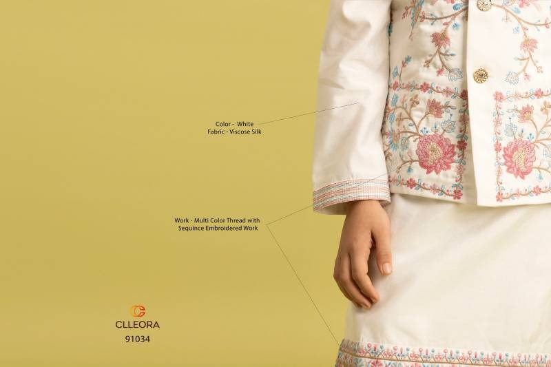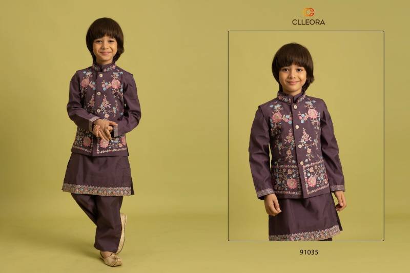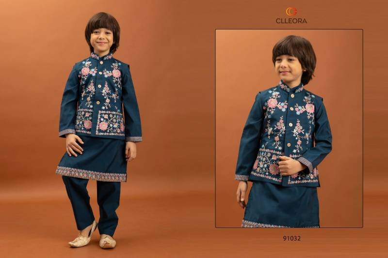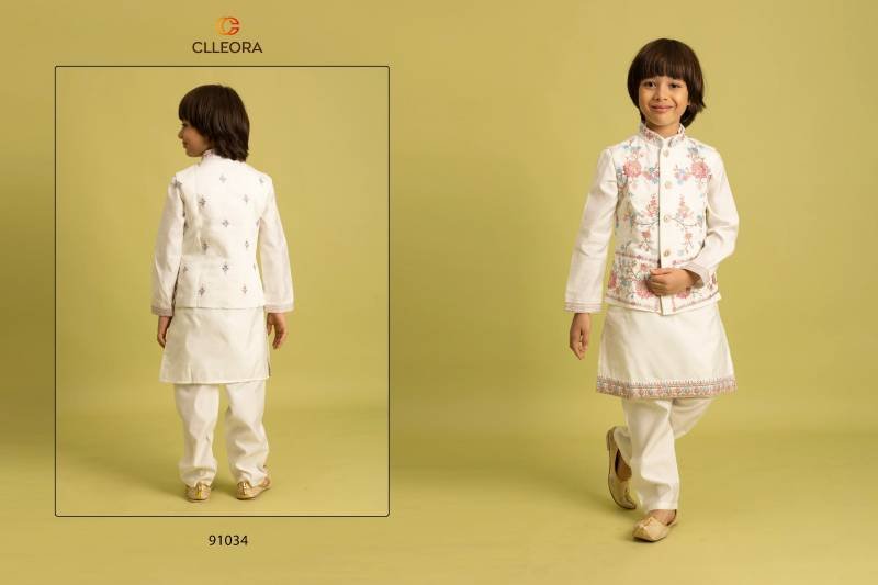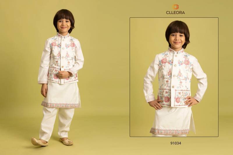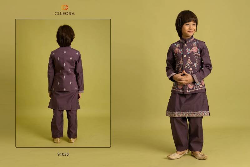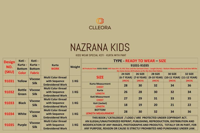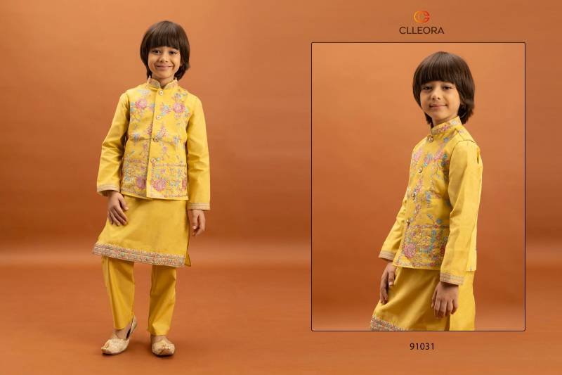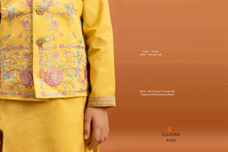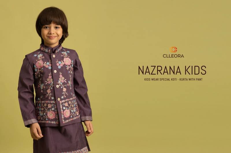 Clleora Nazrana Kids Viscose Silk Embroidered Work Kurta Pant And Koti Wholesale