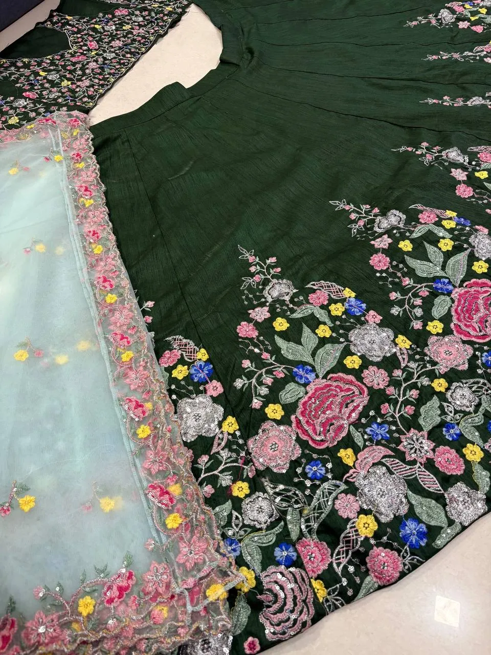 | Product Details | Lehenga – Premium Super Satin Silk With Embroidery Sequins Work, Can-Can & Canvas Patta, Semi-Stitched, 4 Meter Flare, Length 42, Size Up To 44 | Blouse – Super Satin Silk With Sequins Embroidery Work, Unstitched 1.4 Meter | Dupatta – Butterfly Net With Embroidery Sequins Work, Length 2.3 Meter | Package Contains – Lehenga, Blouse, Dupatta |