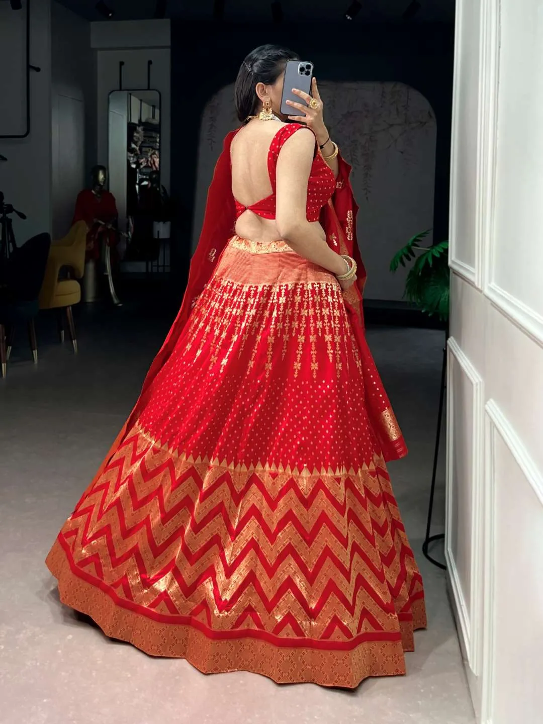DetailsLehenga Fabric – Silk, Zari Weaving Work, SUPPORTED UP TO 42, Drawstring, Flair – 3.40 Meter, | Blouse Fabric – Silk 0.80 Meter | Dupatta Fabric – Silk, Length – 2.40 Meter