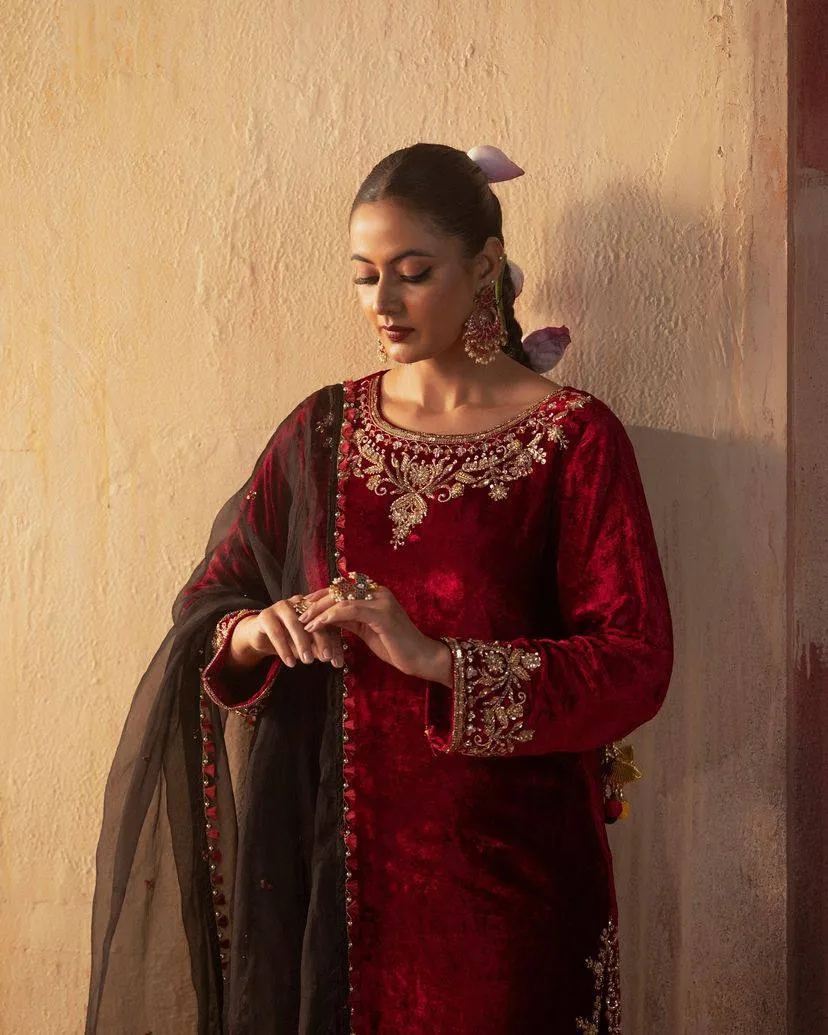| Product Details | Top – Heavy Velvet With Sequins Work, Fully Stitched, Length 39 Inch, Fits Up To Size 44 | Pant – Heavy Velvet With Sequins Work, Fully Stitched, Fits Up To XXL | Dupatta – Heavy Georgette With Sequins Work And Fancy Lace Work | Package Contains – Top, Pant, Dupatta |
