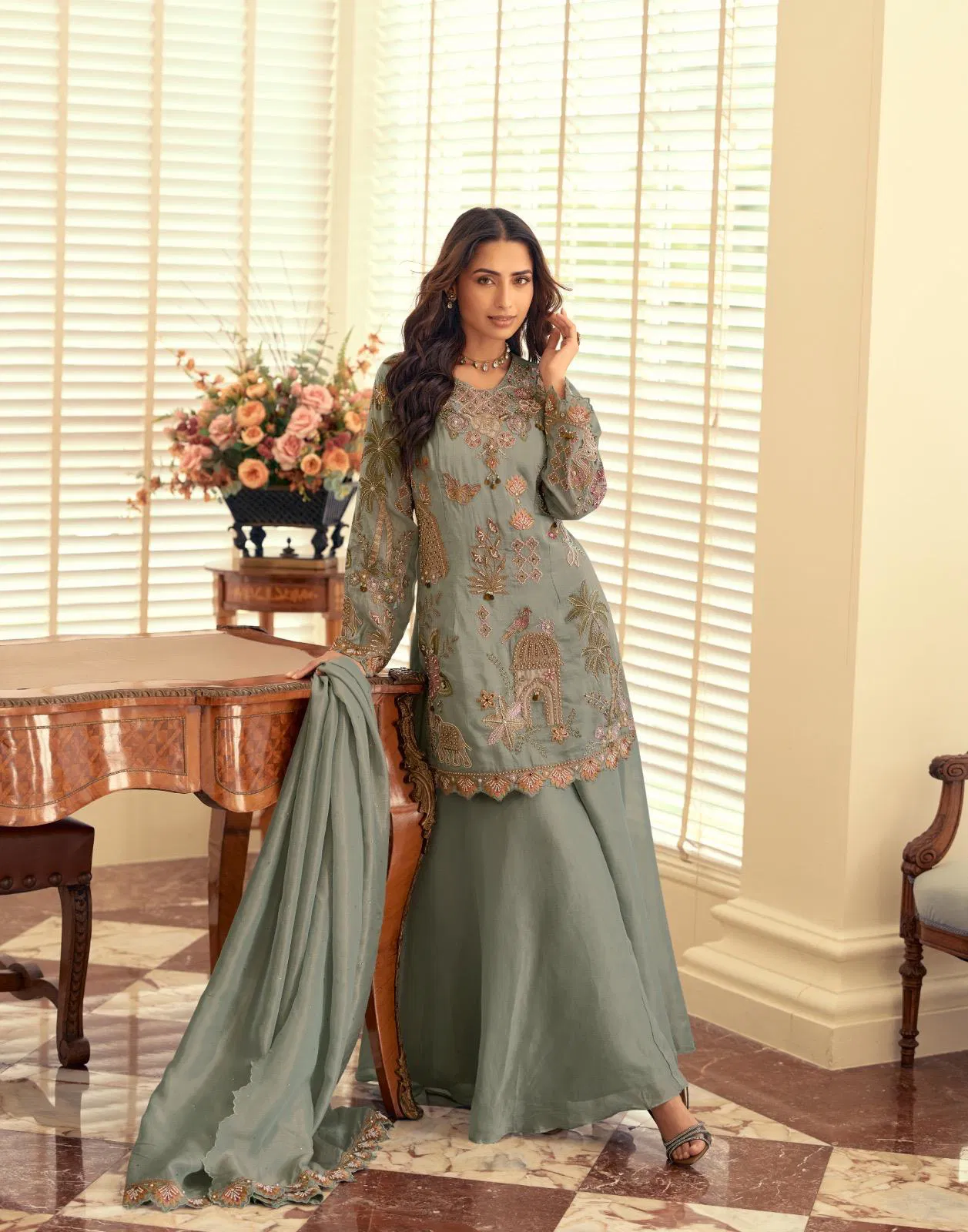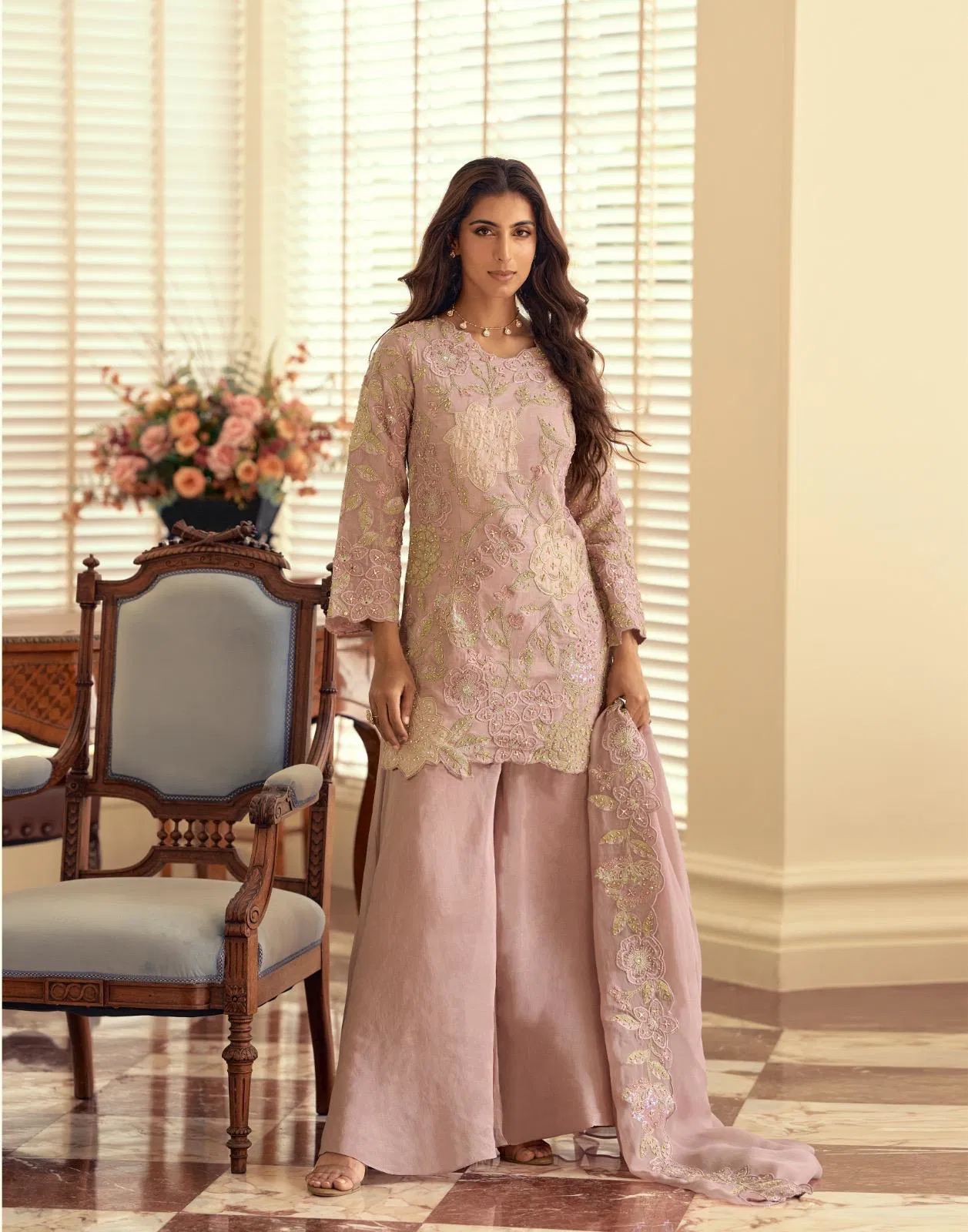 | Details | Top/Bottom/Dupatta :- Premium Simar Silk (Latest Trendy Paksitani Style Beads And Hand Work Embroidered Top With Plazzo And Dupatta ) | |