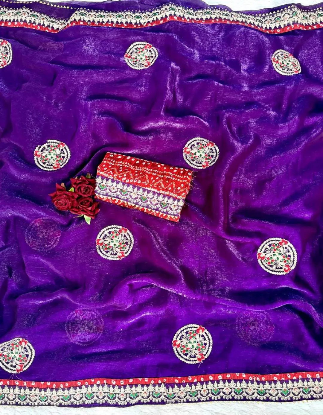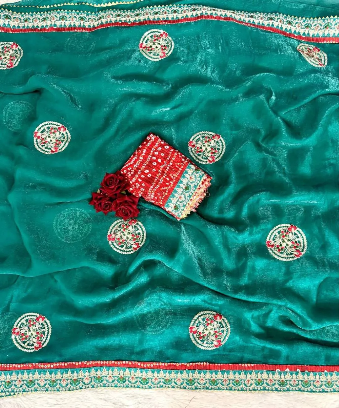 | Product Details | Saree – Premium Fandy Chiffon With Cording Multi Sequence Work, Rayon Bandhani Print Lace Border And Peacock Butta Design All Over, Length 5.50 Meter | Blouse – Rayon Bandhani Print Designer Blouse Piece, Unstitched | Available In 5 Beautiful Colours | Package Contains – Saree, Blouse |